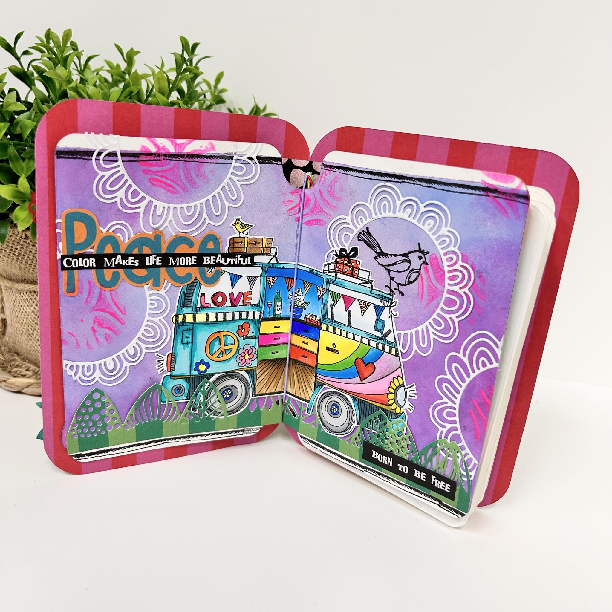 In de nieuwe collectie zit ook een hele handige stans voor het maken van je eigen journal. Met deze set kun je de buitenkant van je journal stansen maar ook alle bladzijdes aan de binnenkant. Je kunt natuurlijk zoveel bladzijdes toevoegen als je zelf wilt. Een leuk elastiek erdoorheen en pimpen maar. In deze journal set zitten ook nog leuke accessoires die je kunt gebruiken bij het pimpen. Aan de binnenkant heeft Jilldis de nieuwe hippie bus gestempeld en gekleurd.