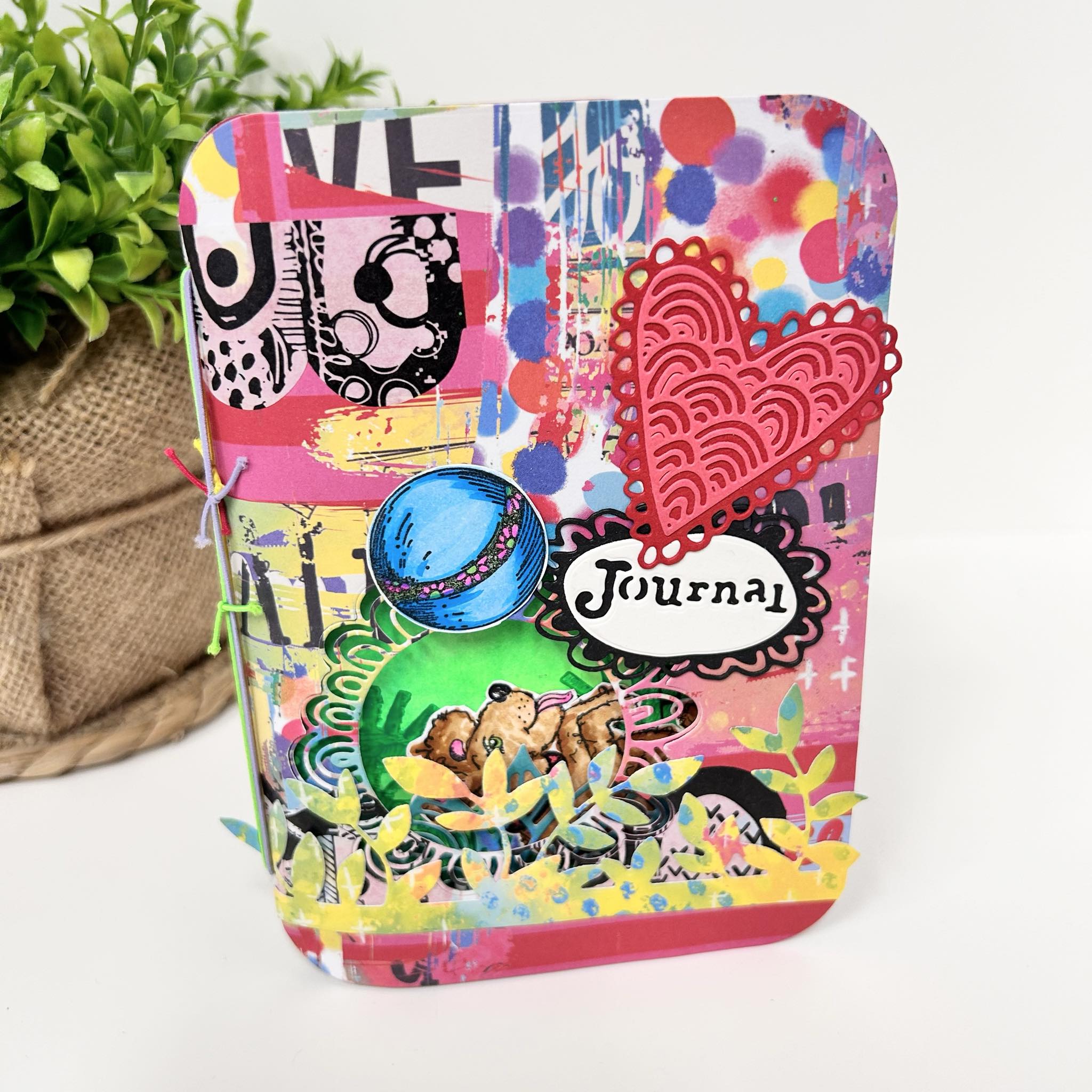 Jilldis heeft de journal set ook gebruikt bij onderstaande projecten. Zien jullie hoe verschillend deze weer zijn. Op de voorkant van onderstaand journal heeft Jilldis de nieuwe stempel Frieda’s friends gebruikt. In deze stempelset zitten ook nog allemaal dierenstempels die je weer leuk met elkaar kunt combineren. Het konijntje voorop het journal heeft Jilldis met krimpfolie gemaakt zodat je een heel klein bedeltje krijgt. Hiervoor gebruik je de krimpfolie van Vaessen.