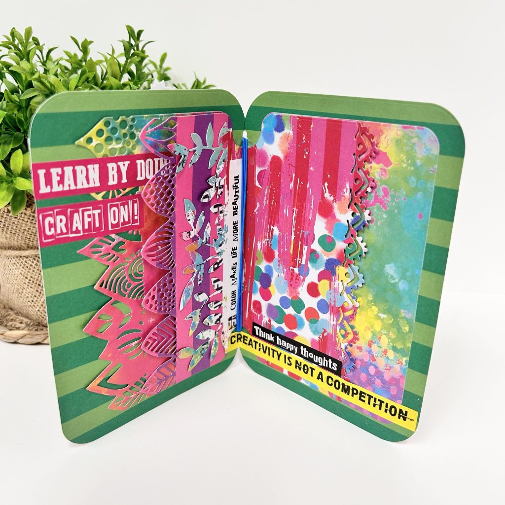 Aan de binnenkant van het rechter journal heeft Jilldis de nieuwe border stansen gebruikt. Dit zijn twee verschillende borders die je weer prima met elkaar kunt combineren.