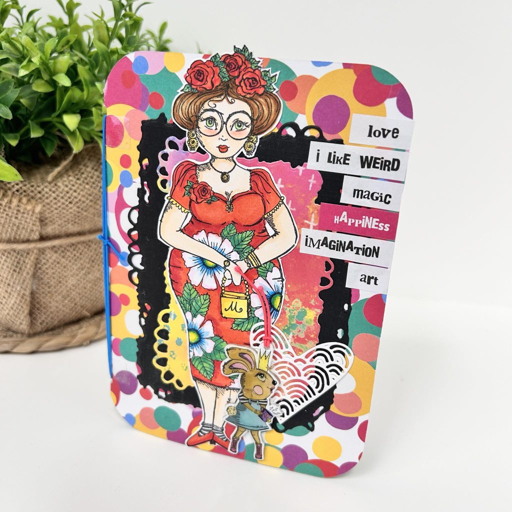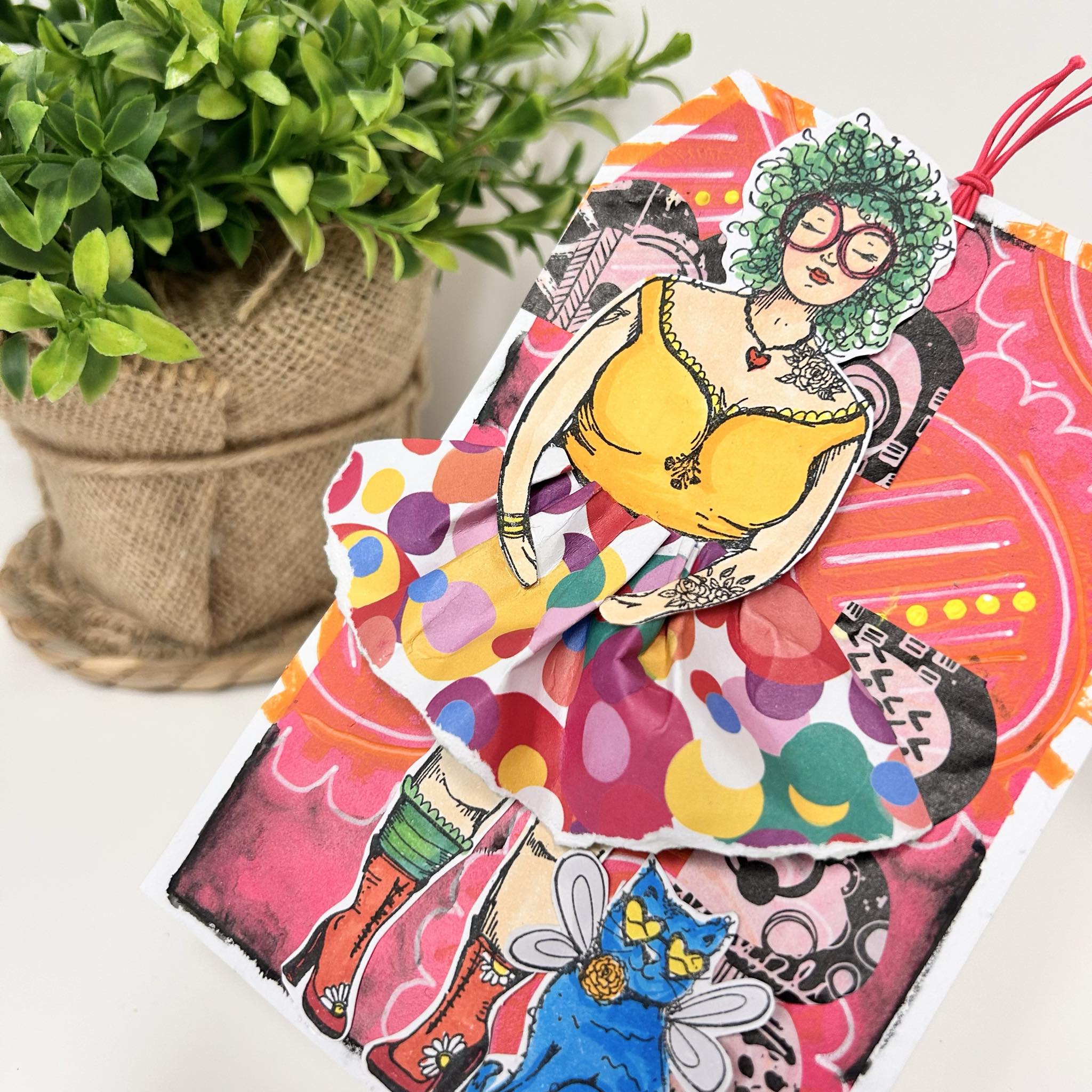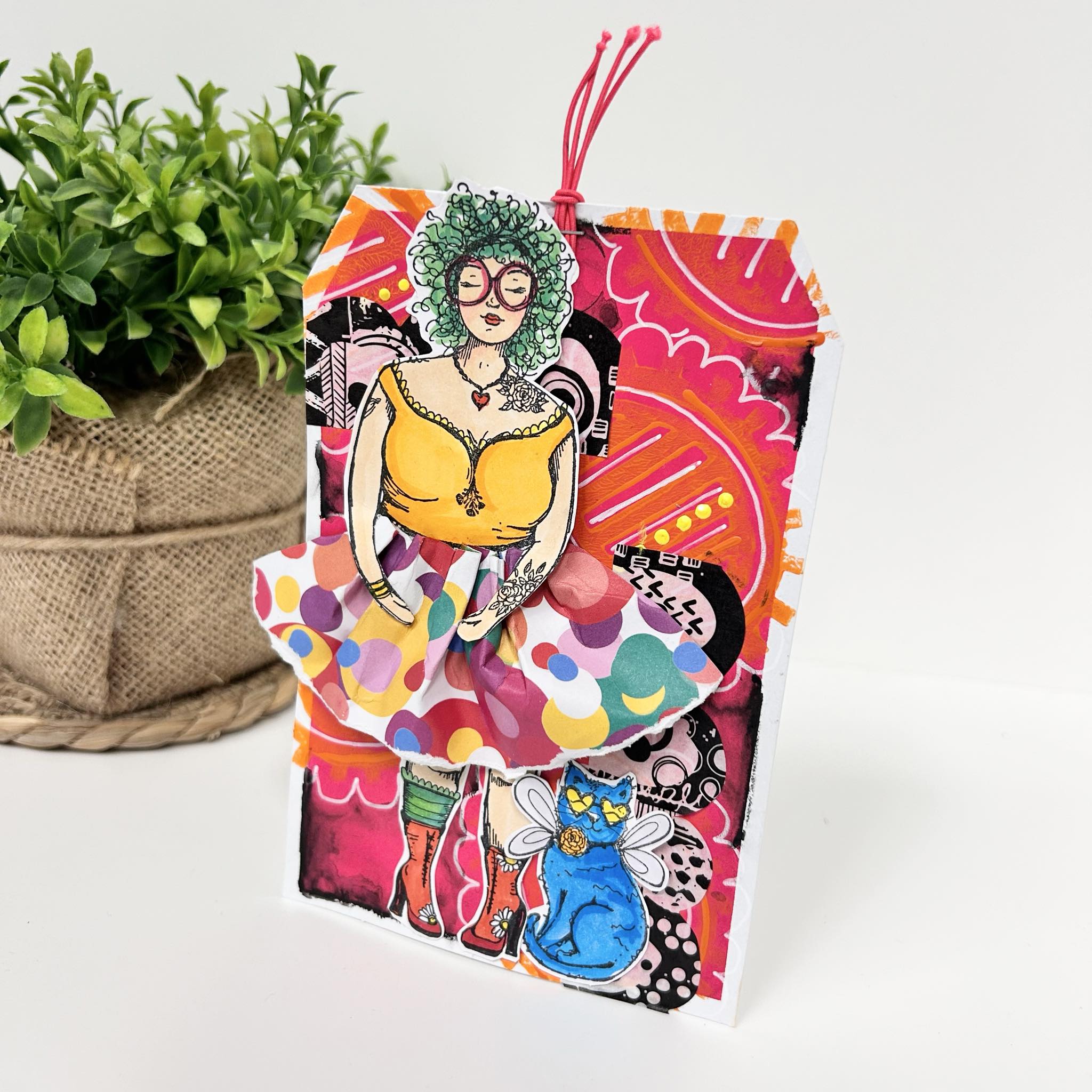 De collectie Art by Marlene is altijd heel erg kleurrijk met lekkere felle kleuren. Voor onderstaande tag heeft Jilldis de nieuwe stempel doggie diva gebruikt. De rok heeft Jilldis gemaakt van designpapier. Zien jullie wat voor een leuk effect dat geeft. De kat rechtsonder komt uit de andere stempelset genaamd Frida’s friends.