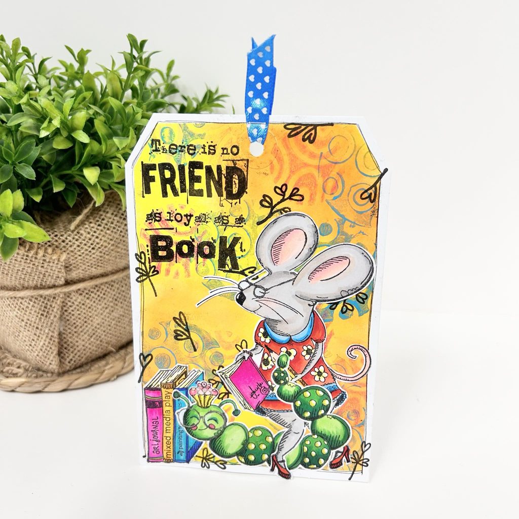 Voor onderstaande tag heeft Jilldis de nieuwe stempel smart bookworm gebruikt. In deze stempelset zitten zowel de muis, de bookworm, de boeken en de tekst.