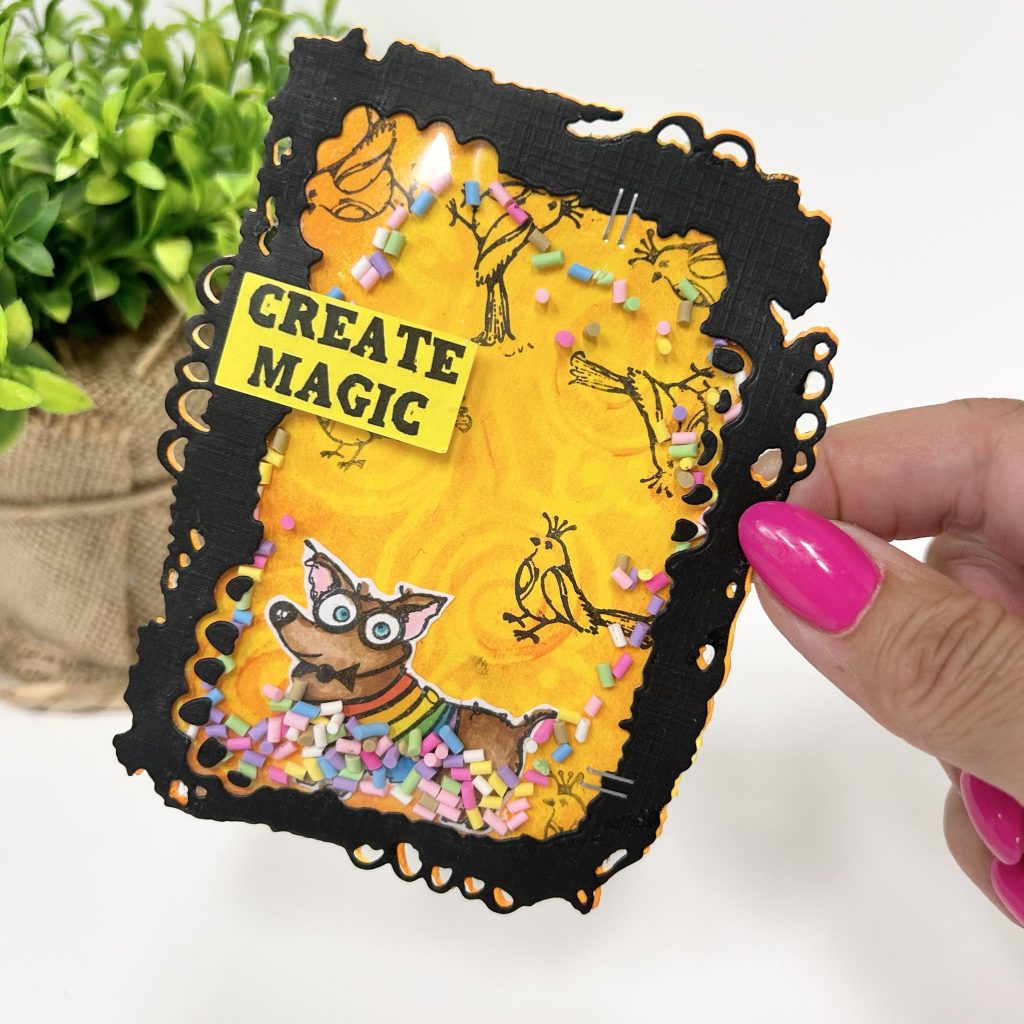Een vrolijk schudkaartje mag tuurlijk niet ontbreken bij deze kleurrijke collectie. Het hondje in het schudkaartje komt uit de stempelset doggie diva en die kun je natuurlijke alle kleuren van de regenboog geven. De vogels op de achtergrond zijn gestempeld met de frida’s friends stempel.