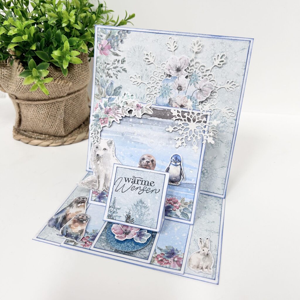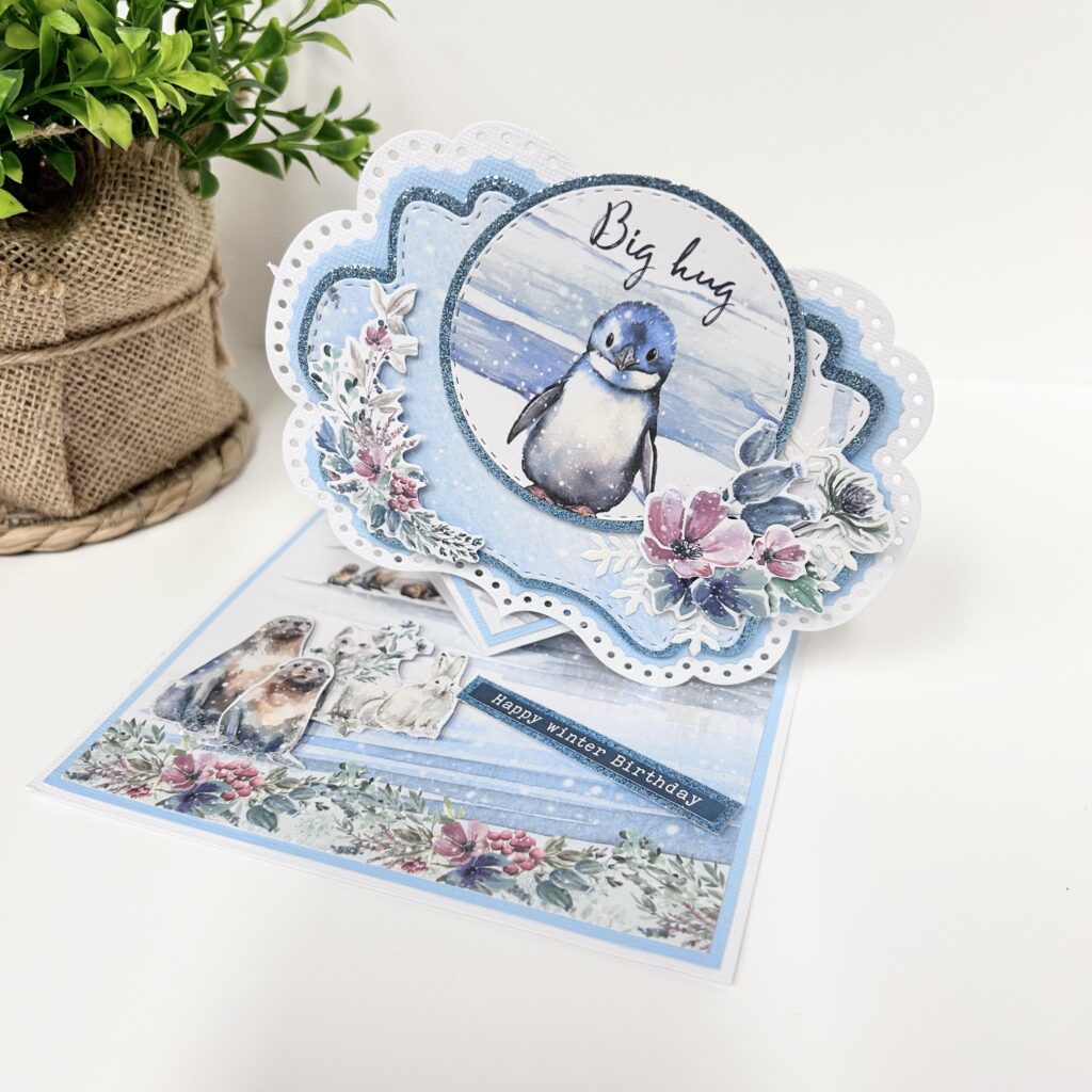 Bij het designpapier zitten ook weer leuke plaatjes die je erbij kunt verwerken zoals de pinguin die je op haar easelkaart ziet. Ze heeft er ijsblauw glitterkarton van Bella Lulu bij gebruikt. Dit past er perfect bij en geeft net even wat extra.