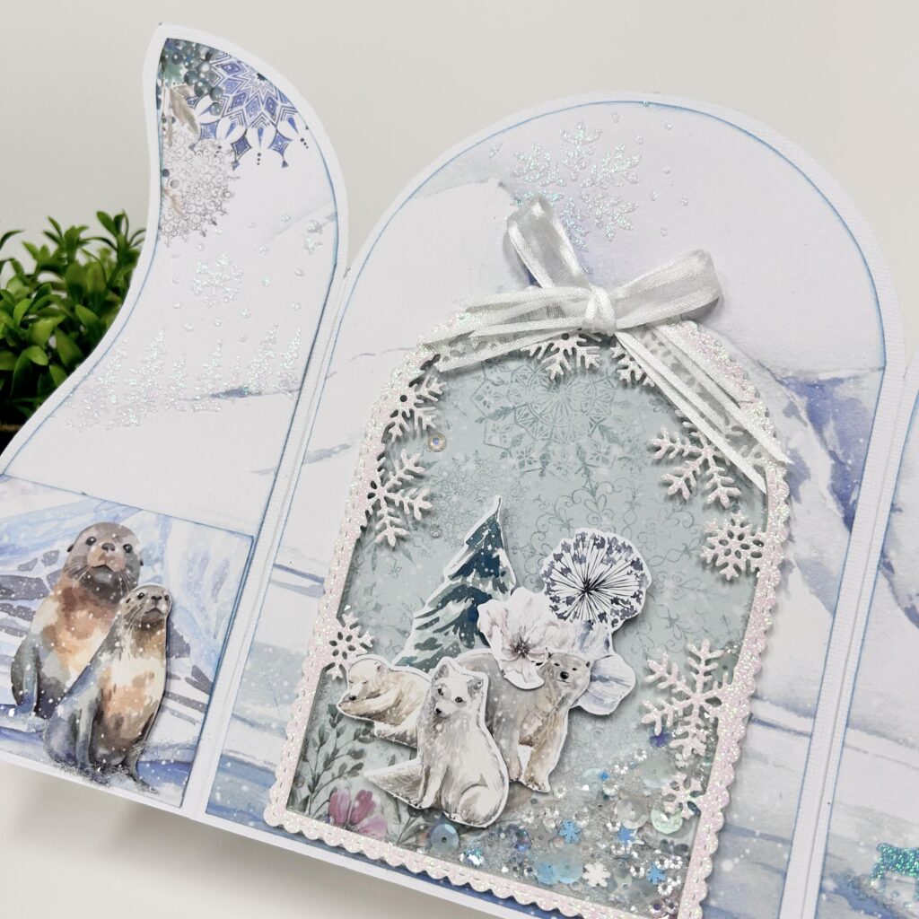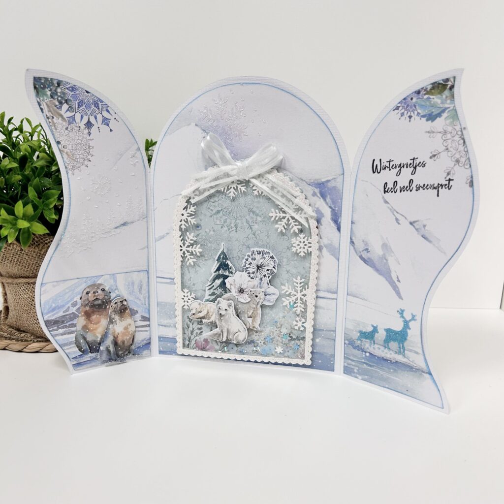 De laatste kaart is gemaakt met een fold art mal van Dutch Doobadoo en daarop de nieuwe dome stans met ijskristallen. Als je deze met mica combineert kun je een schudkaart maken. Hiervoor heeft ze foamstrips ertussen geplakt.