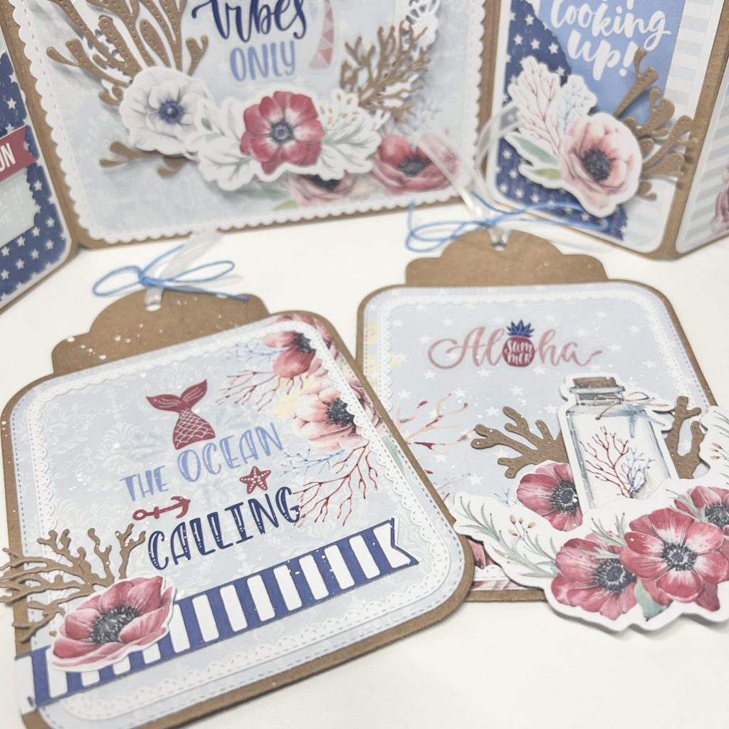 Het designpapier, de plaatjes en de teksten komen allemaal uit de collectie ocean calling van Dutch Doobadoo. De labels die Jolanda heeft gebruikt komen uit onze grote MAGAZIJN UITVERKOOP en daar hebben we er nog een paar van op voorraad. De label stans van CraftLab shop je nu met 50% korting. Dit geldt ook voor de CraftLab striped banner stans.