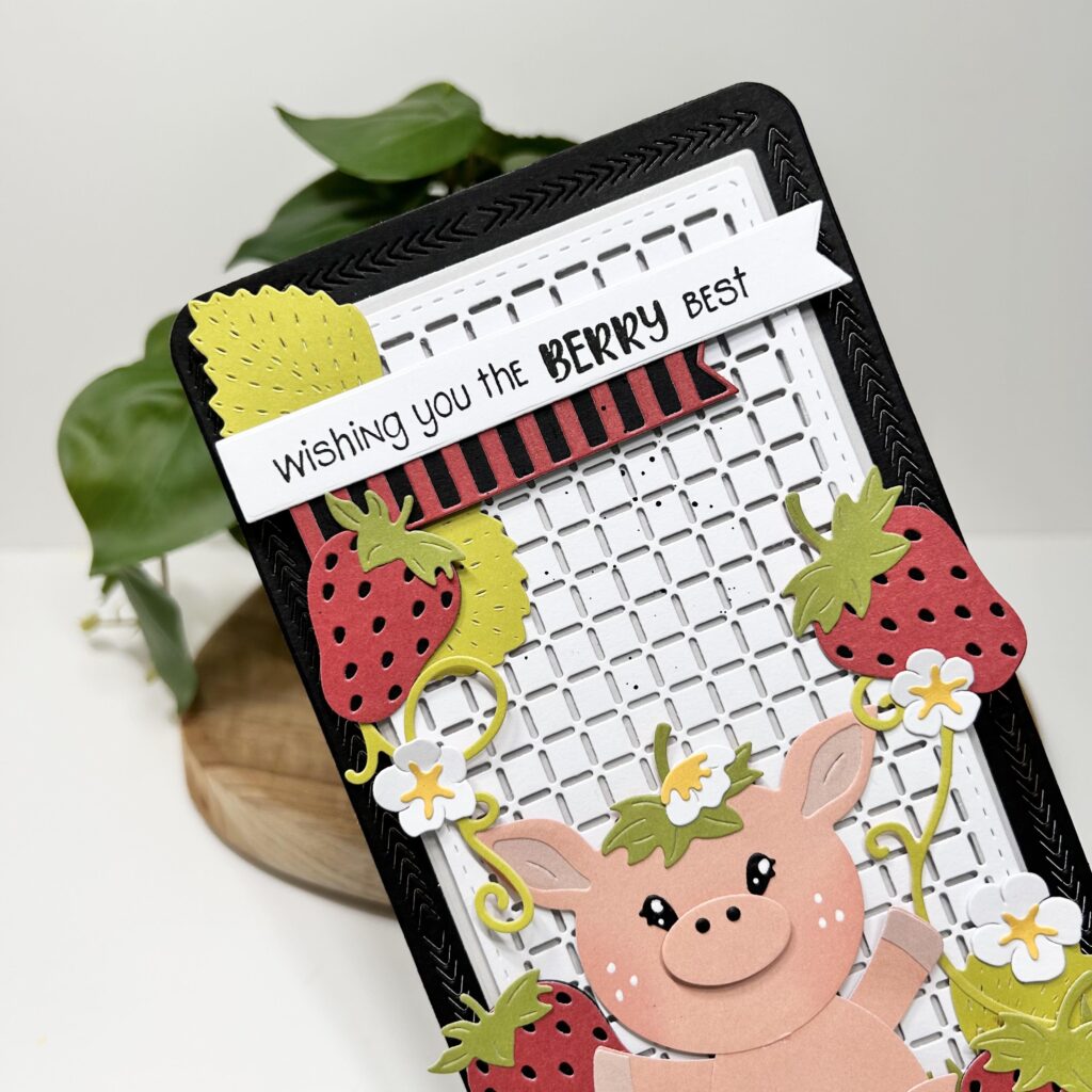 Voor de basis van haar kaartje heeft Jolanda de weaving slimline mal van studio light gebruikt. Zien jullie hoe mooi deze mal is. Door hem te matten op het grijze paperpad van craftlab en op zwart cardstock komt de mal nog mooier uit. De weaving mal heeft Jolanda opgeplakt met de slimline foamstrips van studio Light. Kijk Frenkie eens lekker zitten in het gras tussen de aardbeitjes. Door een dubbel grasrandje te maken krijg je nog meer diepte in de kaart.