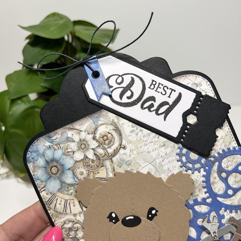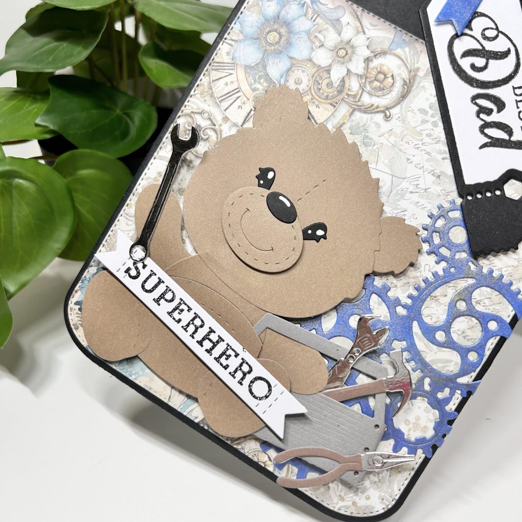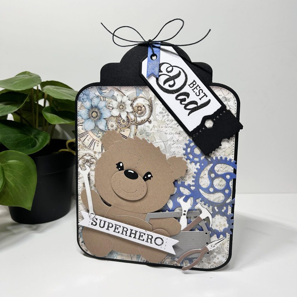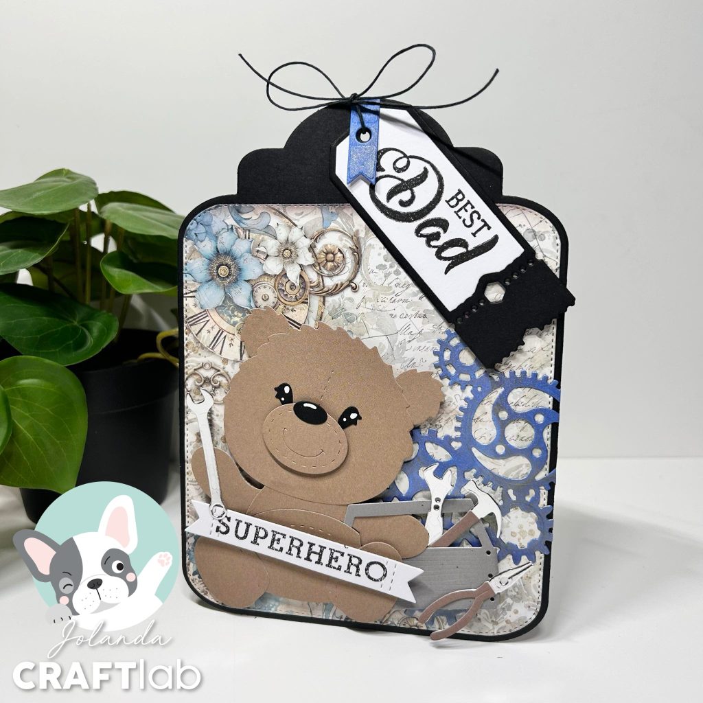 Er is maar één superhero en dat is natuurlijk onze Ted. Kijk hem eens druk in de weer met de toolbox en het nieuwe gereedschap van Studio Light. De teksten superhero en best dad komen uit de nieuwe Engelse Vaderdag stempel van Studio Light. De tekst “best dad” heeft Jolanda gestempeld op het nieuwe ticket van Studio Light. Het ticket heeft Jolanda bovenaan het label vastgemaakt met behulp van een stukje zwart hempcord.