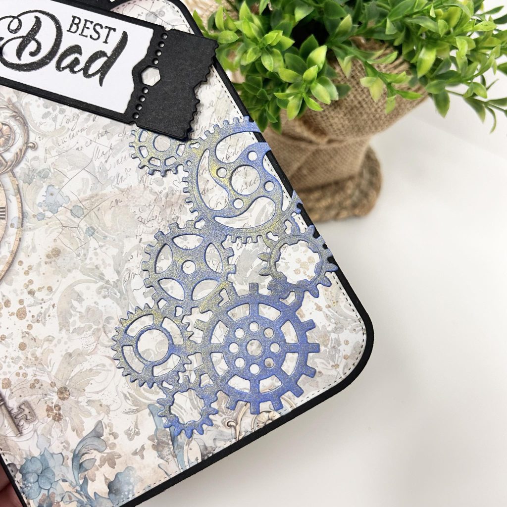 Voor de basis van haar kaart heeft Jolanda de large tag van CraftLab gebruikt. Deze heeft ze gestanst uit zwart cardstock van Bella Lulu. Het designpapier is van Stamperia genaamd Sir Vagabond en is uitermate geschikt voor het maken van stoere mannenkaarten.