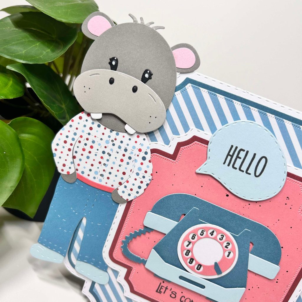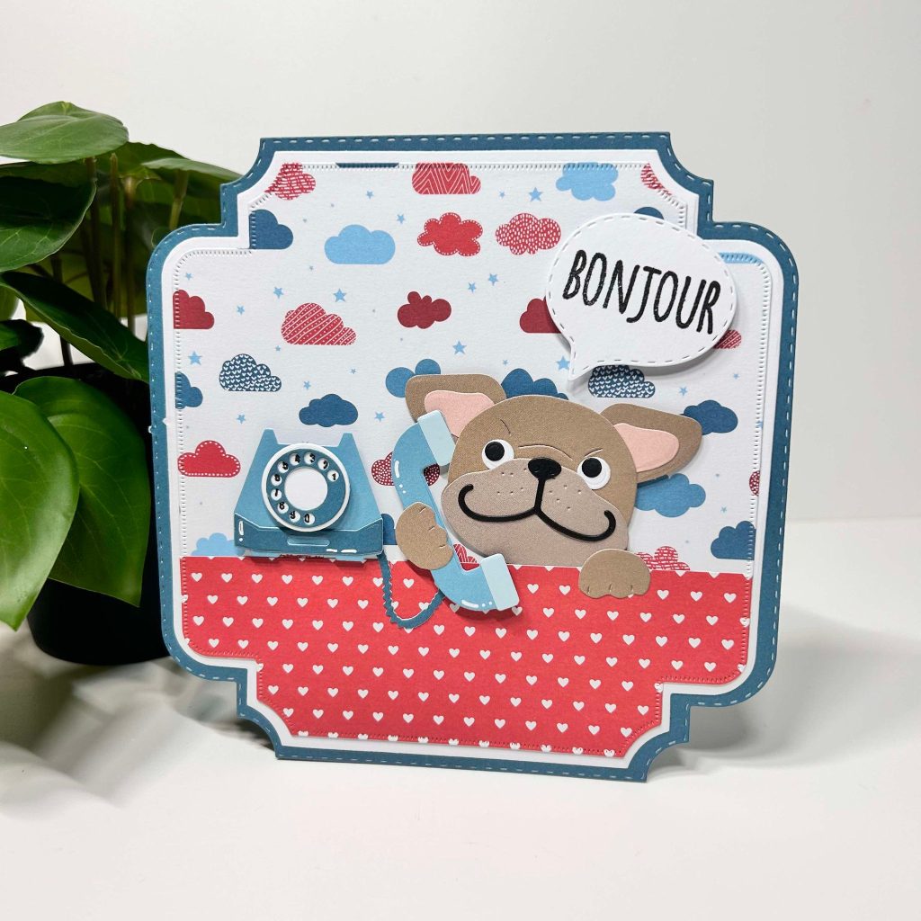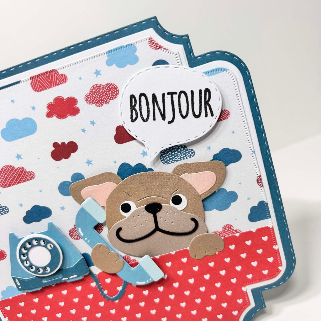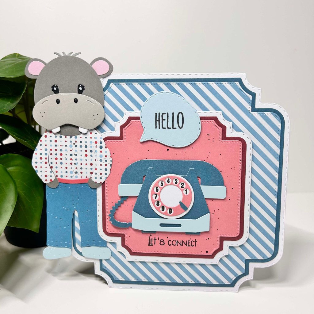 Jolanda heeft voor de basis van haar kaart de postage stamp mal van CraftLab gebruikt. Het leuke designpapier let’s connect heeft Jolanda gebruikt in combinatie met het effen cardstock. Onze Buddy is druk aan het bellen en hij spreekt al een aardig woordje over de grens. De speech bubbles met bijpassende teksten vind je ook in deze release. De telefoon heeft Jolanda gestanst uit het effen papierblok.
