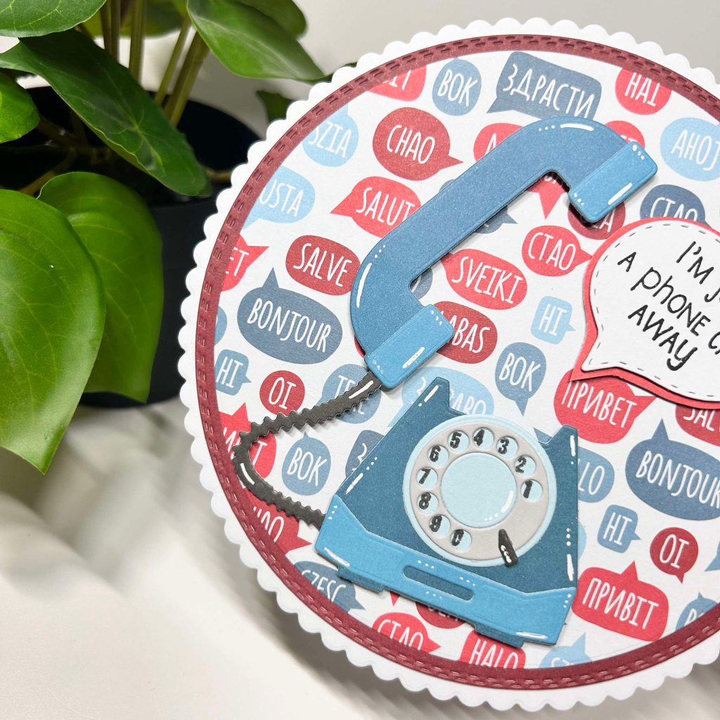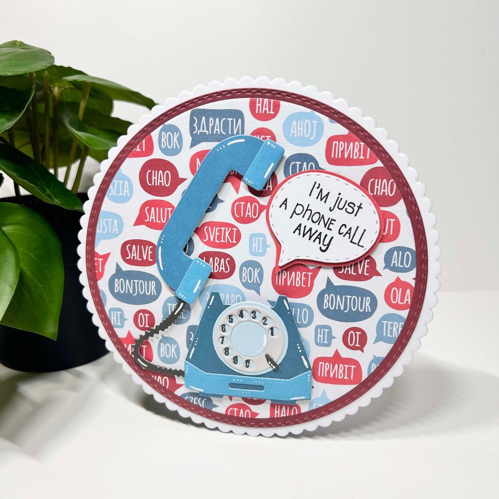 Deze ronde kaart is gemaakt door Linda. Voor de basis heeft ze de nested circles van CraftLab gebruikt. Het designpapier heeft ze gemat op het effen cardstock. Bij de stansmal van de telefoon zit ook deze ronde stempelset met cijfers zodat je niet elk cijfer apart hoeft te stempelen, hoe handig is dat? I’m just a phone call away is één van de leuke teksten uit de nieuwe stempelset.