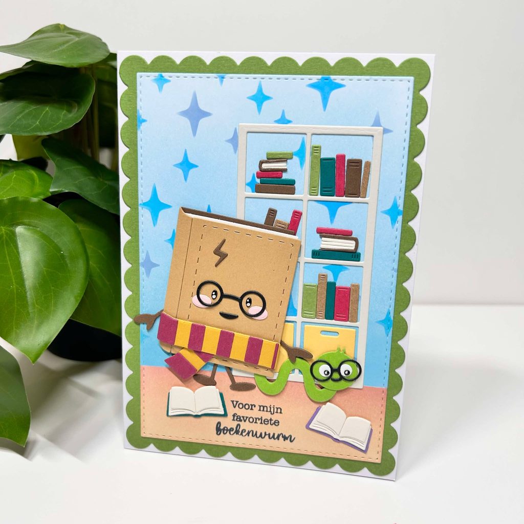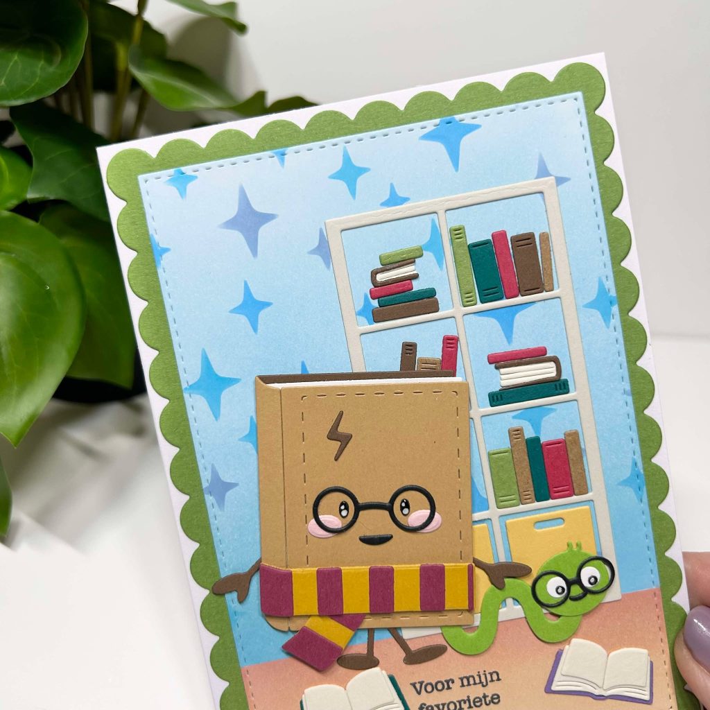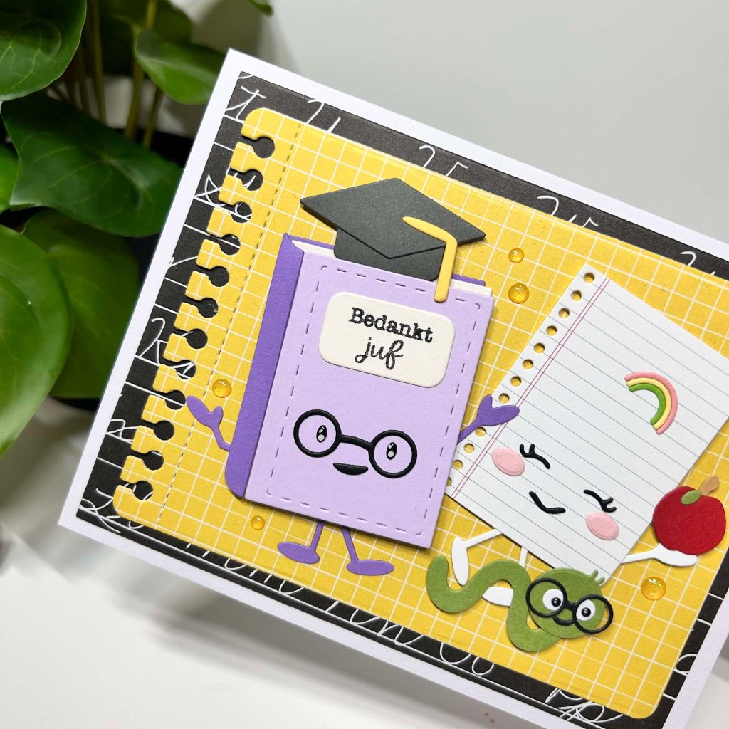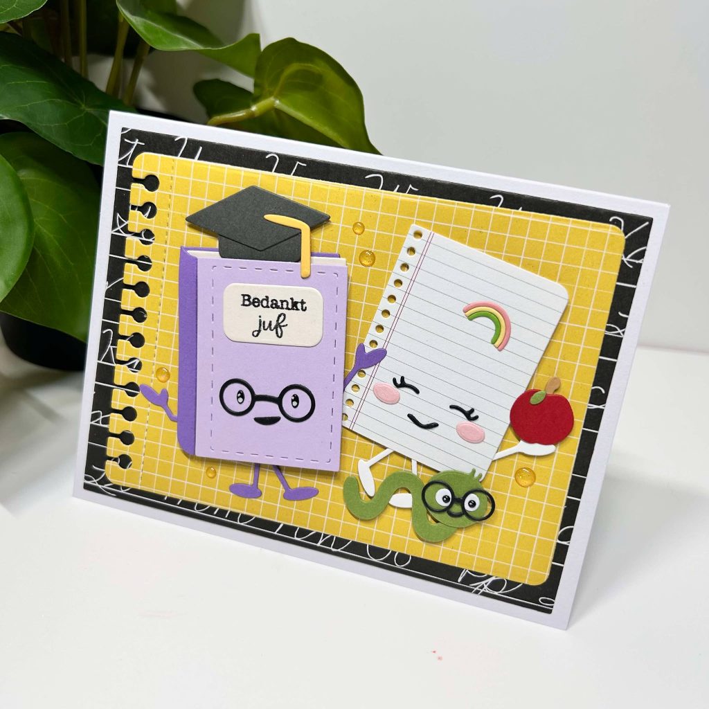 Met de nieuwe boeken collectie maak je natuurlijk ook leuke bedankt kaartjes voor de meester of juf. De tekst bedankt juf zit ook in de nieuwe stempelset dus deze kun je voor heel veel verschillende gelegenheden gebruiken. Het leuke brilletje zit ook bij de mal van de book buddies.