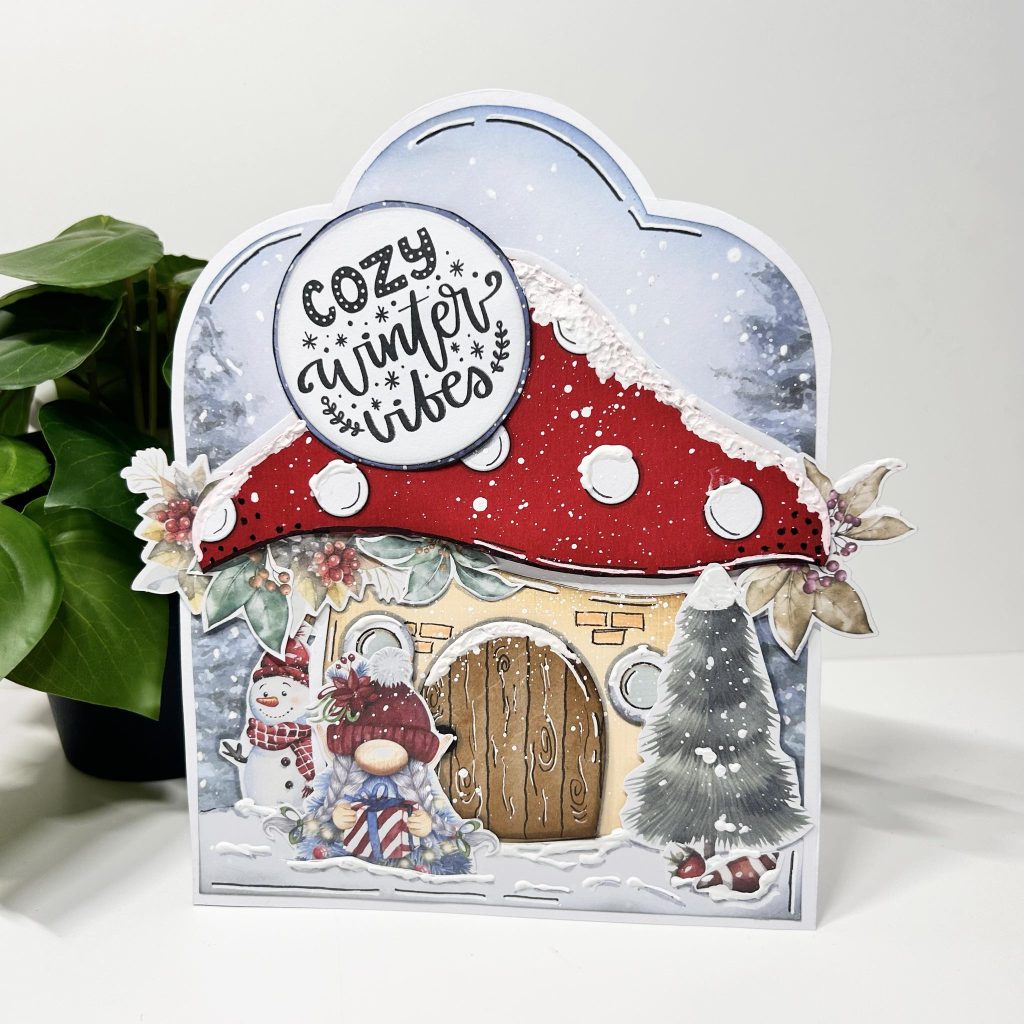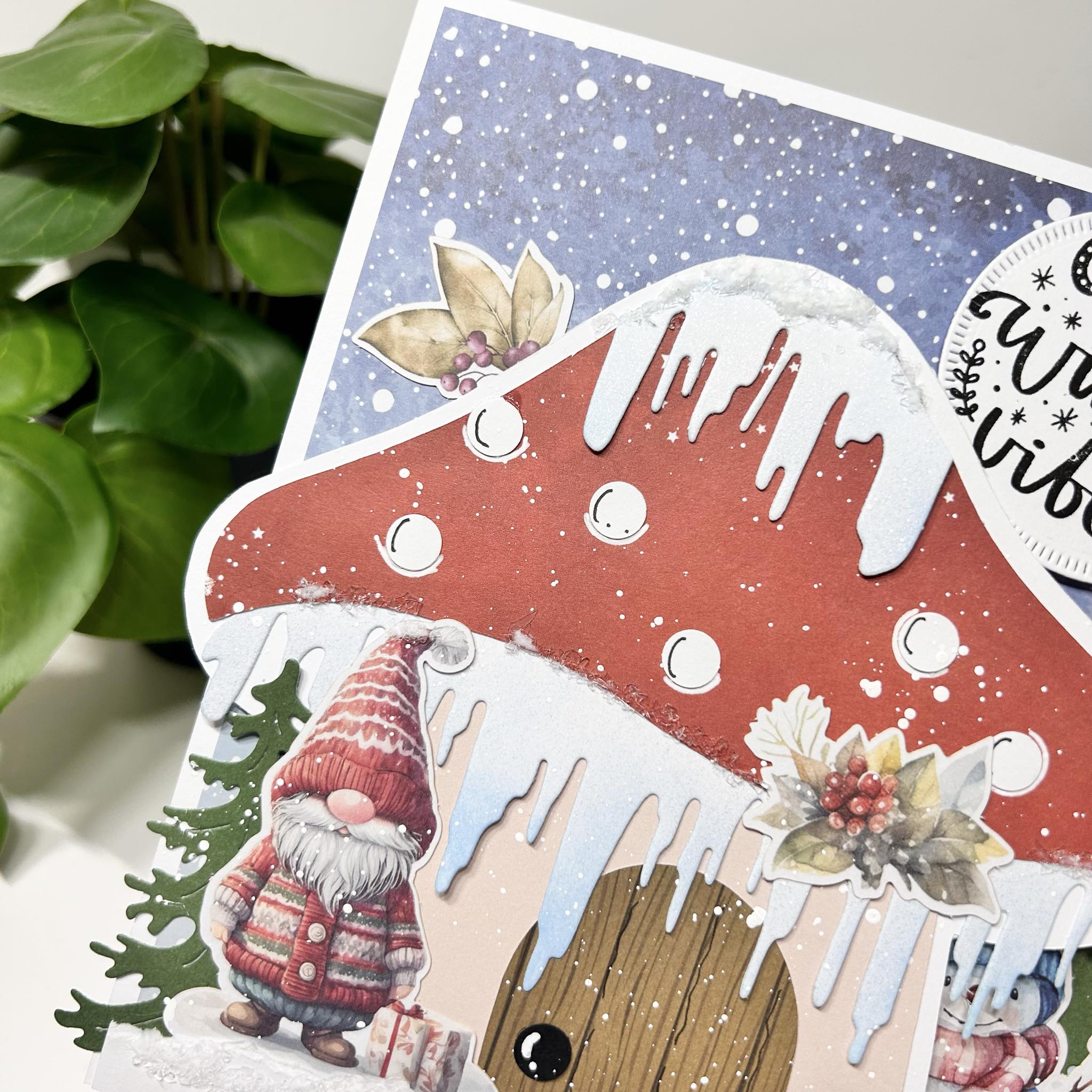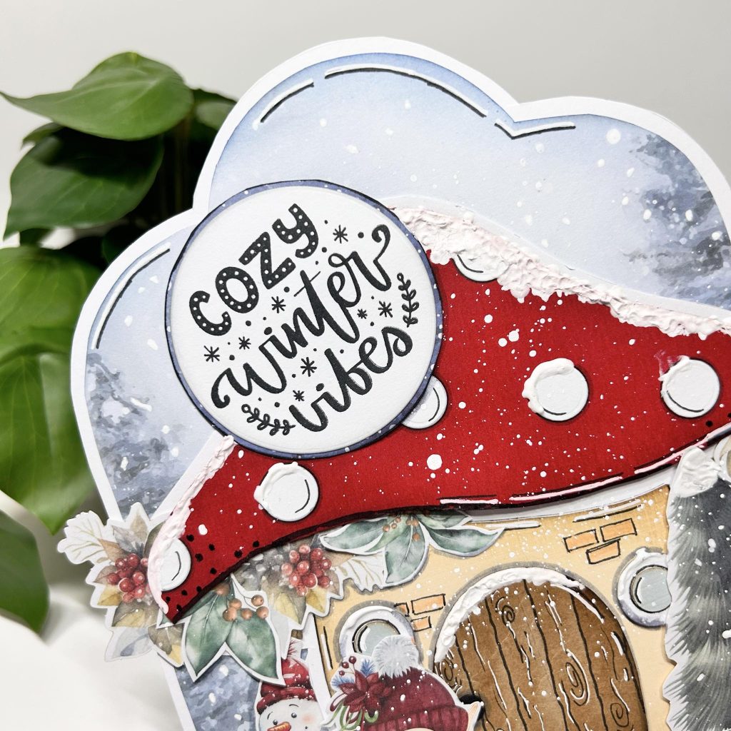 In de nieuwe knippen en plakken met Jaap zitten meerdere tekenmallen waaronder deze leuke paddenstoel. Jolanda heeft deze paddenstoel verwerkt op een vierkant kaartje. Het designpapier cold days en de stansplaatjes kun je ook weer los aanschaffen. Handig als je snel door je papier uit de set heen bent. De boompjes die Jolanda heeft gebruikt komen uit de collectie van CraftLab. Door de paddenstoel verhoogd op te plakken en een ijsrandje te maken en nog wat sneeuw krijg je een echt winters kaartje. De rubberen stempel cozy winter vibes zit ook in de nieuwe knippen en plakken met Jaap.