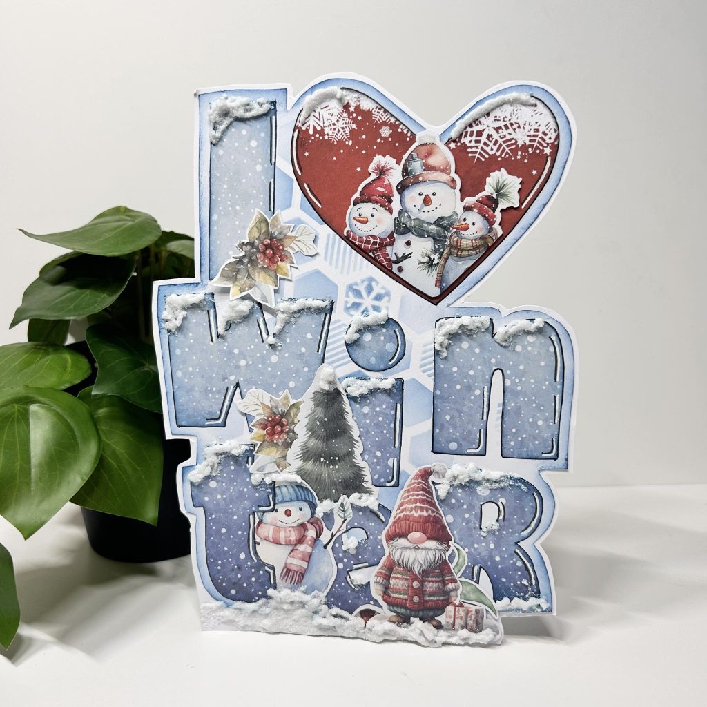 Ook de tekenmal I love winter zit in de nieuwe knippen en plakken met Jaap. Christa heeft er weer een schitterend kaartje mee gemaakt. De accenten op de letters maakt Christa met een blackliner en een signo pen. De sneeuw heeft Christa gemaakt met een snowmarker.