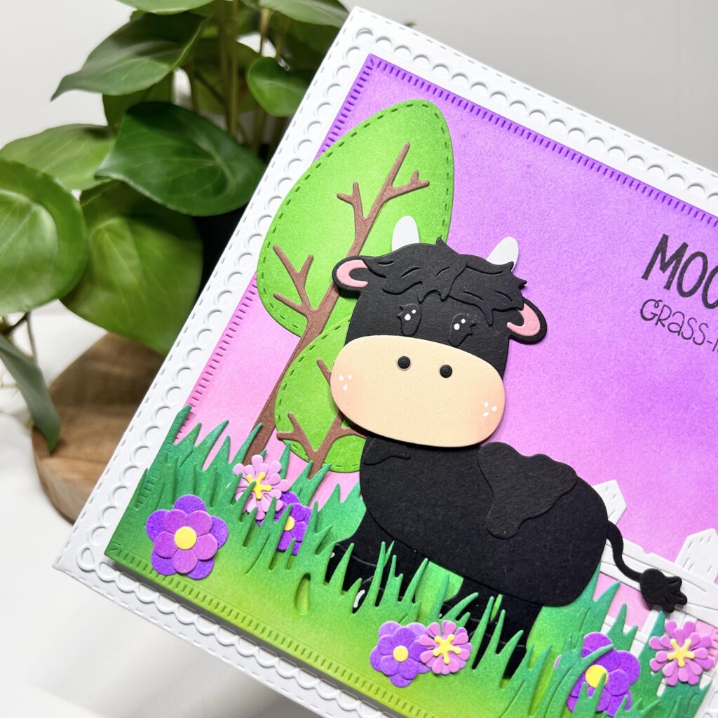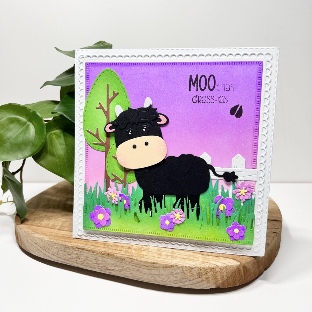 Behalve een koe en een schotse hooglander kun je van Betty ook een stier maken zoals Myrthe op haar kaart laat zien. Door Betty uit zwart te stansen krijg je al direct een heel andere uitstraling. Ook Myrthe heeft op haar kaart de nieuwe bomen en het nieuwe gras gebruikt. De stier ziet er zo heel schattig uit maar hij staat voor de zekerheid toch maar achter een hek. De tekst MOOchas grass-ias zit ook in de nieuwe stempelset holy cow. Myrthe heeft het gras en de bomen op kleur gemaakt met de nieuwe CraftLab inkten.