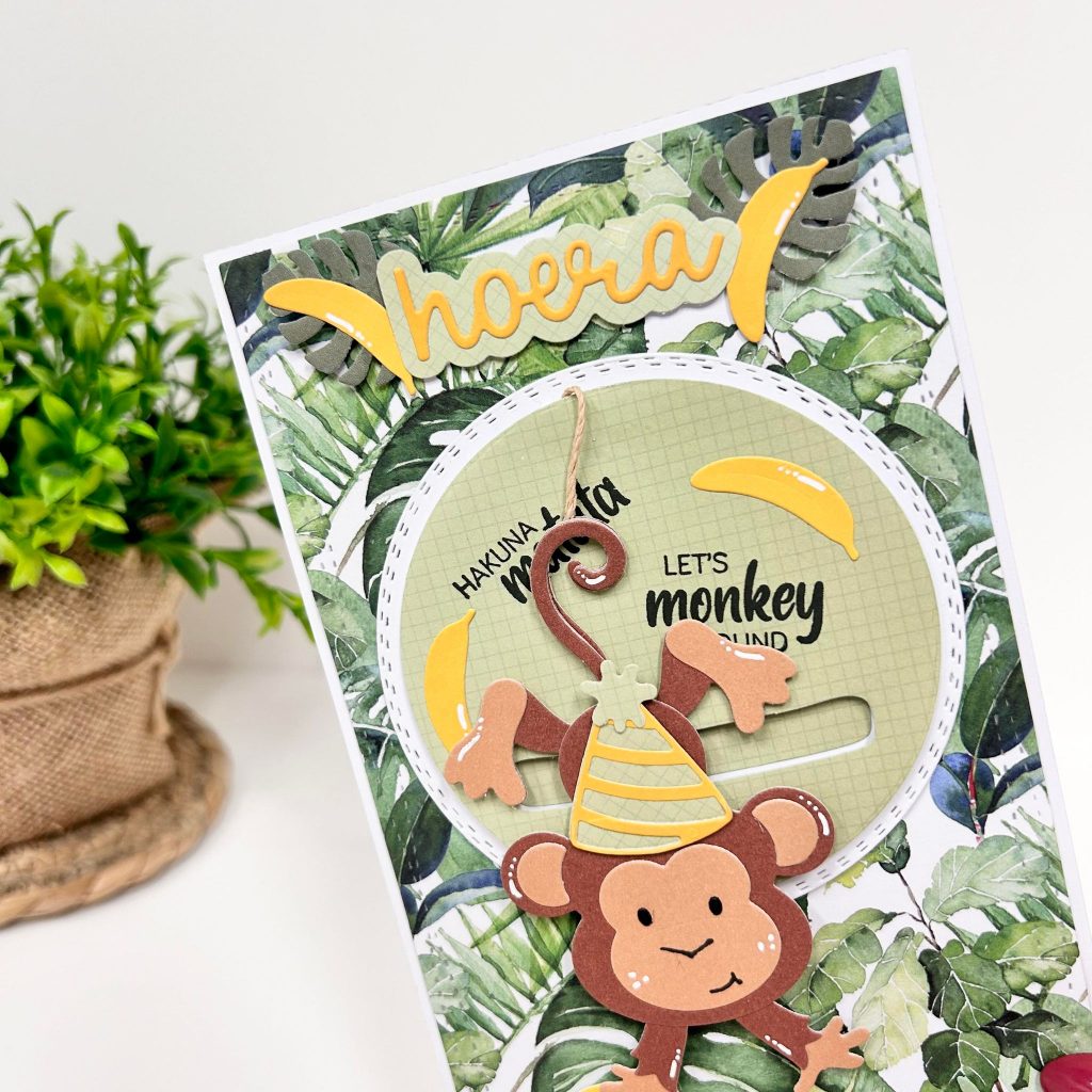 Ook op onderstaand interactief kaartje heeft Gerlinde het leuke aapje gebruikt van ECD. Gerlinde heeft met behulp van de nested circles van Craftlab een interactief gedeelte gemaakt in haar kaart. De gleuf van het interactieve gedeelte heeft Gerlinde gemaakt met de bumper van de CraftLab-auto. Aan de achterkant van de cirkel heeft ze een 2 eurocent muntje met daarop dik smal foamtape geplakt en hierop weer een cirkel. Het touwtje heeft ze tussen 2 lagen cardstock van de staart van het aapje geplakt zodat het touwtje goed vast zit. Het andere uiteinde van het touwtje heeft ze aan de achterkant van de cirkel met tape en lijm vastgezet. Zo kan het aapje lekker alle kanten op zwaaien.