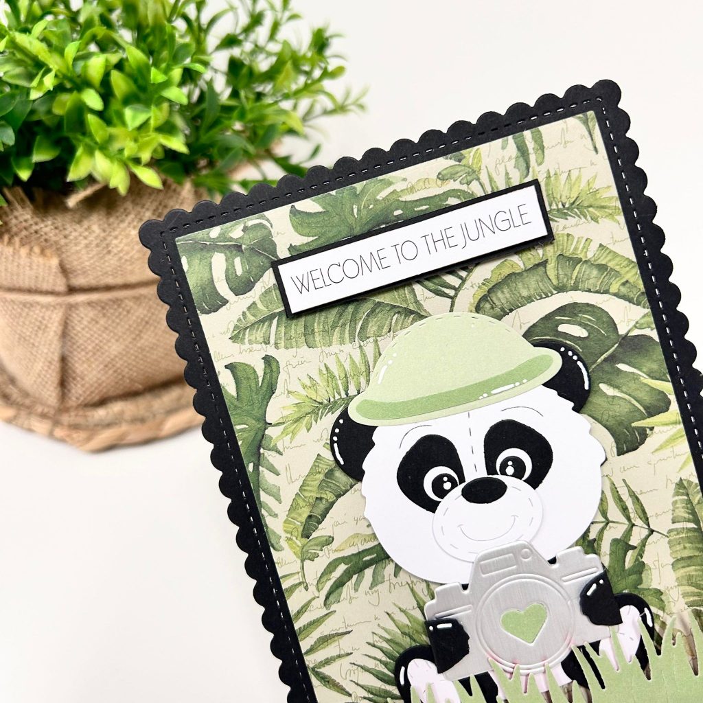 Voor de basis van het laatste kaartje heeft Gerlinde een oudere spotlight mal van Sweet Stories gebruikt. Ted het lieve pandabeertje zit lekker in de jungle foto’s te maken van al het moois wat hij voorbij ziet komen. Het grasrandje heeft Gerlinde gemaakt met de borderz mal van CraftLab. De tekst welcome to the jungle komt ook uit het stansvel uit de nieuwe kit van Dutch Doobadoo.