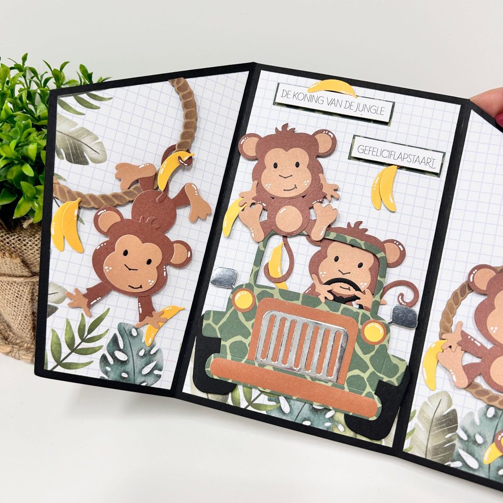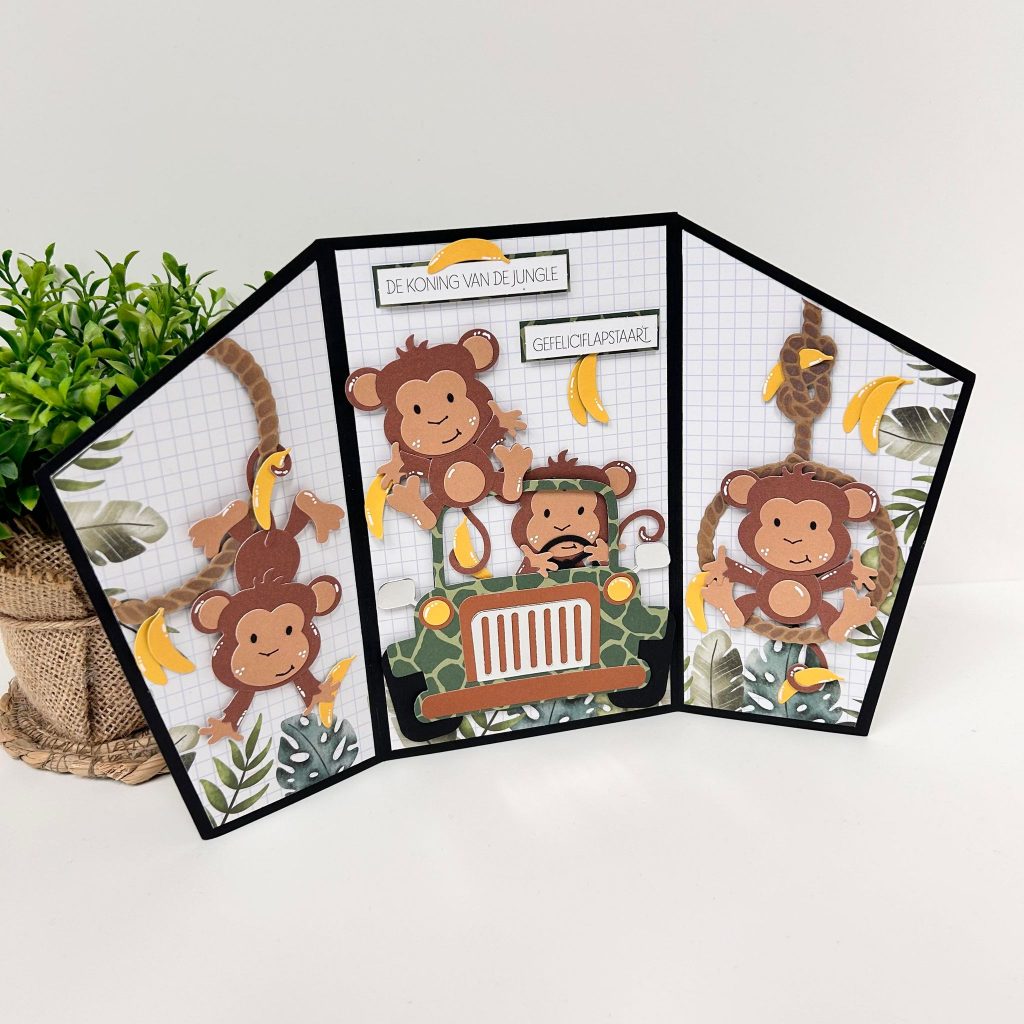 De aapjes van Elizabeth Craft Designs passen ook perfect bij het leuke jungle thema. Voor de basis van onderstaande kaart heeft Gerlinde de fold art mal uit de set welcome to the jungle gebruikt. Het designpapier met de junglebladeren komt ook uit deze set. De touwen waar de aapjes aan zwieren en zwaaien zijn van Marianne Design.