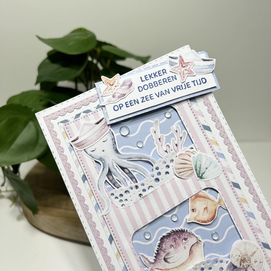 Vandaag willen we jullie in deze blog graag weer een paar onderwaterkaartjes laten zien. De onderstaande kaart is van Monica en zij heeft als basis de CraftLab slimline stans gebruikt. In de Bella Lulu set designpapier diep in de zee zit designpapier met heel veel bijpassende plaatjes en kleine elementjes om te knippen. Ideaal dus om de vakjes van je slimline kaart mee te vullen.