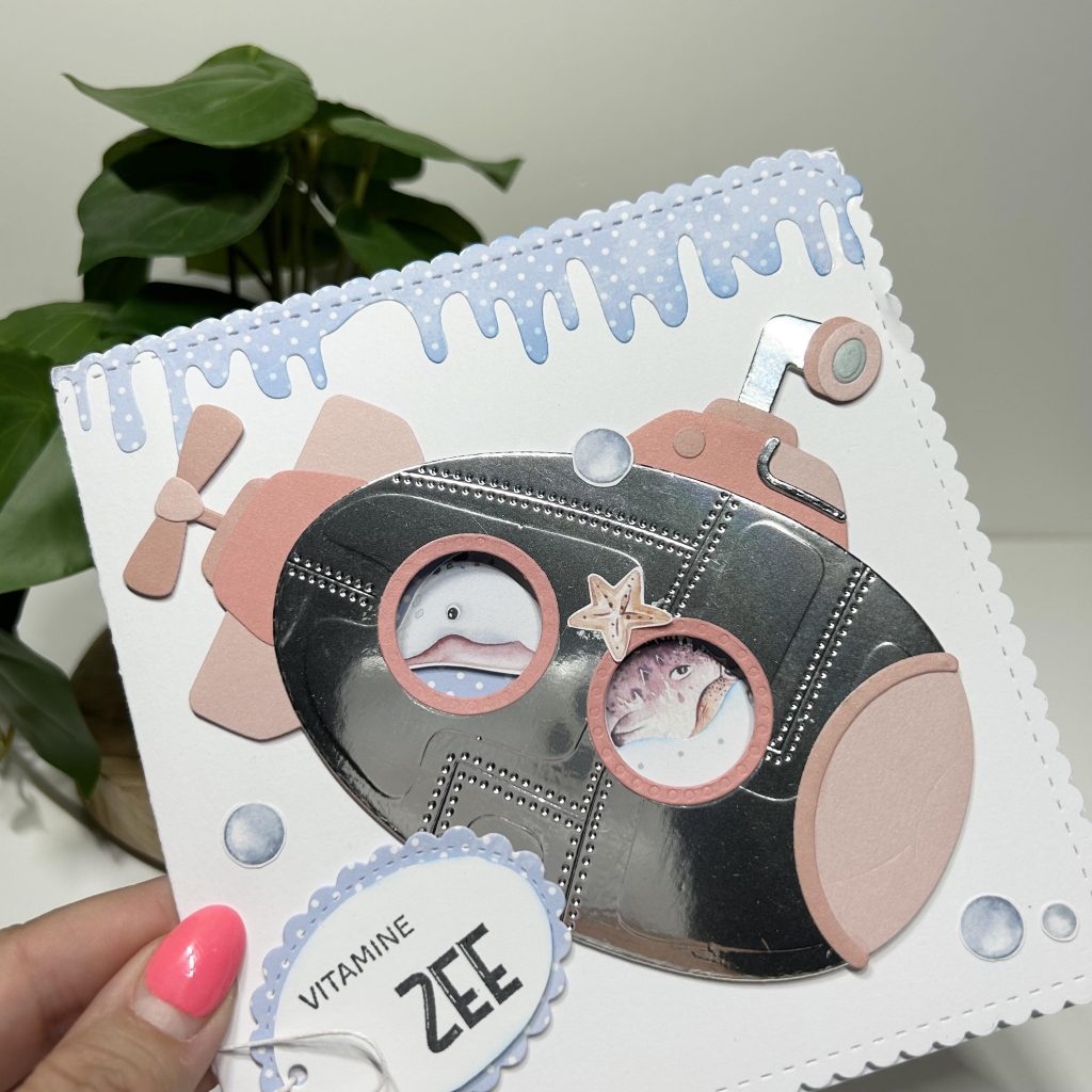 En dit is de kaart van Linda die ze gemaakt heeft voor ons online festijn diep in de zee. Ze heeft hierbij ook de stansmal van de onderzeeer gebruikt uit de Sweet Stories collectie. Als je deze stanst uit zilverkleurig spiegelkarton krijg je een leuk effect. Linda heeft er een dubbele kaart van gemaakt en de raampjes zijn doorkijkers geworden naar de binnenzijde van de kaart.