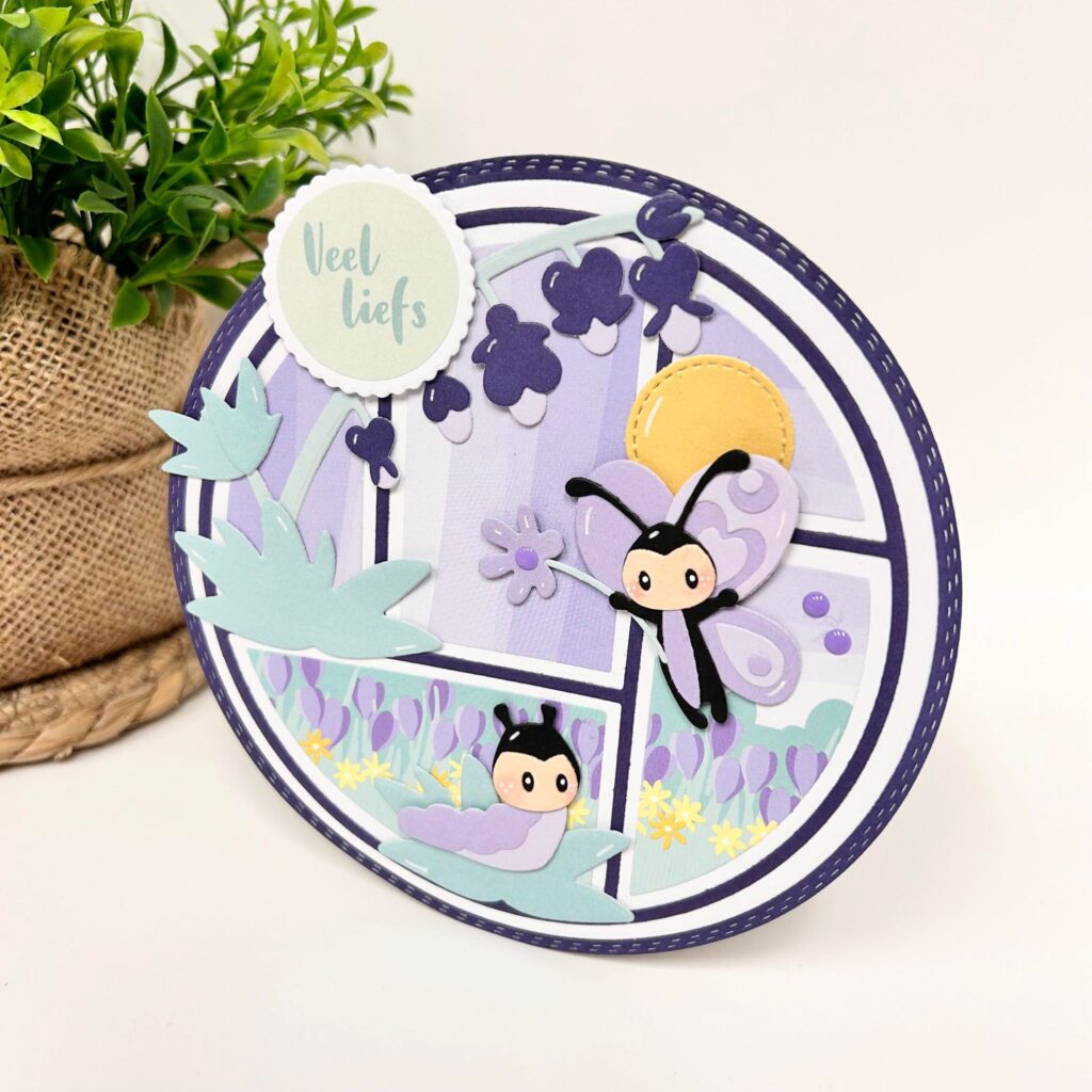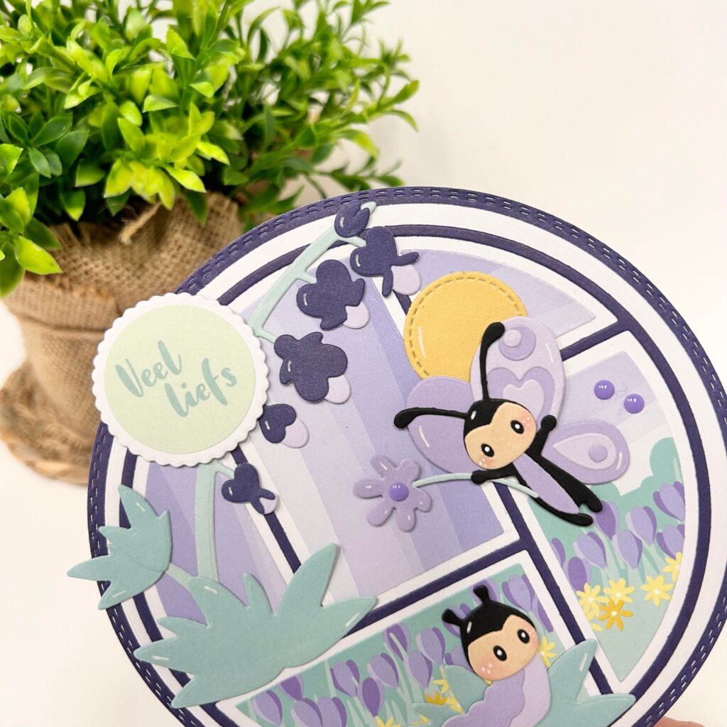 Ook nieuw deze maand is deze circle lay-out mal. Deze nieuwe mal is een stuk kleiner dan de vorige ronde lay-out mal van Marianne Design. Deze nieuwe mal heeft een doorsnede van 12,5 cm. Een ideaal maatje voor het maken van vrolijke kaartjes of natuurlijk om te gebruiken voor het maken van dieptekaarten. Anouk heeft op onderstaand kaartje de nieuwe background gebruikt en deze zo gestanst dat hij past in deze ronde kaart. De ronde mal heeft Anouk nog een keer gemat op de donkerpaarse kleur uit het papierblok spooky colours want deze kleur steekt mooi af bij de paarse kleuren uit het nieuwe papierblok Early Spring. Ook op dit kaartje hebben de vlinders en de nieuwe bloem een plekje gekregen.