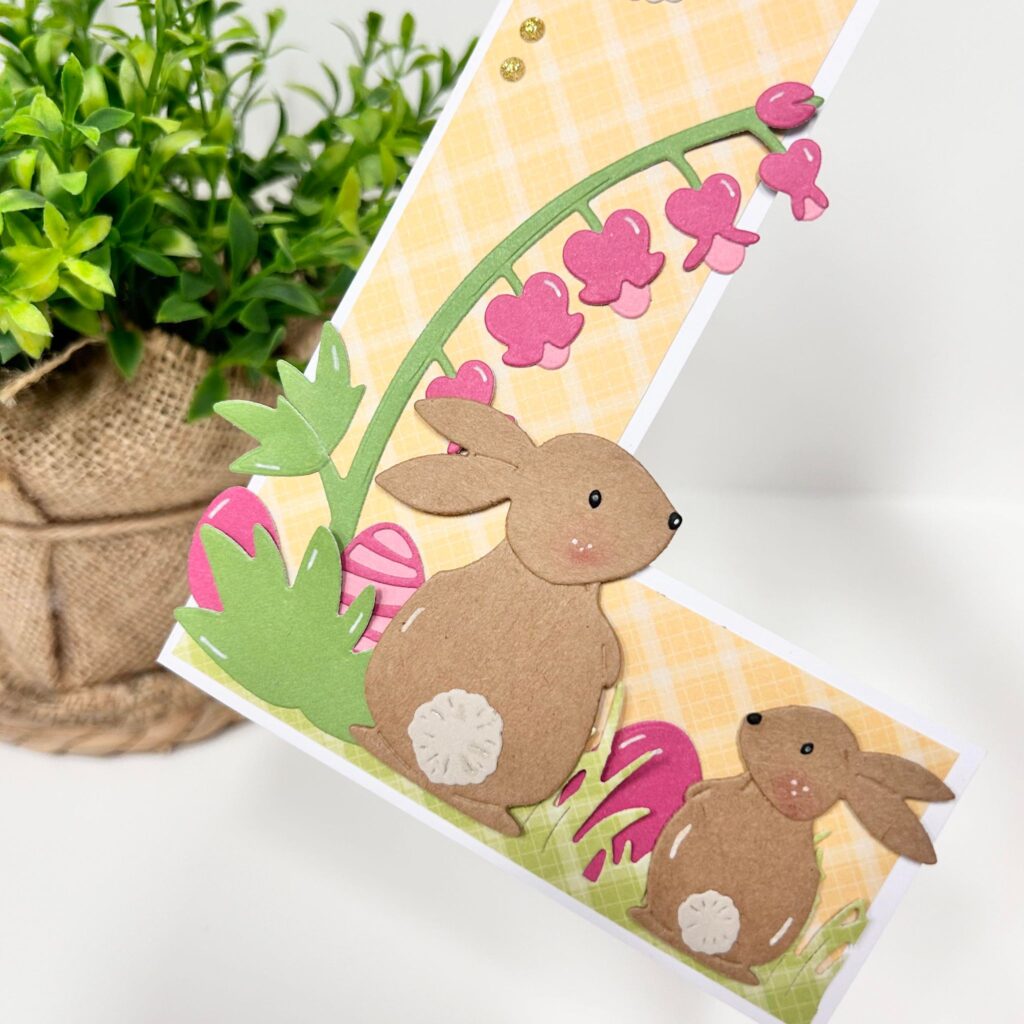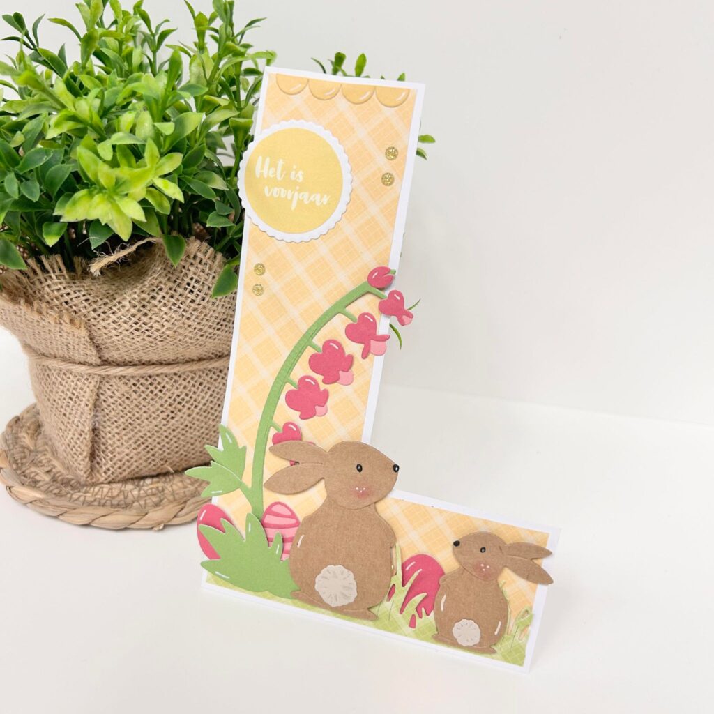Het laatste kaartje van deze blog is een echt Lente kaartje. Vorige maand is het craftstencil L uitgekomen bij Marianne Design en natuurlijk kun je deze letter gebruiken voor het maken van je Lente kaartjes. Ook hier staan de bunnies gezellig naast elkaar in het gras. Ze hebben net de paaseitjes verstopt. De eitjes en de bloemen van de nieuwe collectables mal heeft Anouk gemaakt uit het paperpad partea van craftlab. Bovenaan de letter L heeft Anouk nog een rand gemaakt met de nieuwe scalloped borders. De passende tekst het is voorjaar zit ook in de nieuwe stickerset.