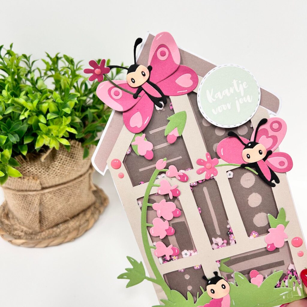 In de februari collectie van Marianne Design zitten allemaal nieuwe materialen voor het maken van Lentekaartjes en Paaskaartjes. De eyecatcher op onderstaande kaart is het lieve vlindertje van Eline. Anouk heeft als basis het craftstencil van het insectenhotel van Marleen gebruikt en hier een shakerkaart mee gemaakt. Het nieuwe shakermateriaal Lucky Blossom met de lieveheersbeestjes past natuurlijk perfect bij het insectenhotel. Zoals jullie zien kun je de nieuwe vlinders in verschillende houdingen maken, zo leuk om ze schuin te laten wegvliegen. Ook de nieuwe collectables mal van het bloedend hart past hier mooi bij. Anouk heeft de bloemen aangepast aan de kleuren van de vlinders zodat alles mooi bij elkaar past. De tekst kaartje voor jou komt uit de nieuwe stickerset voorjaar van Marleen.