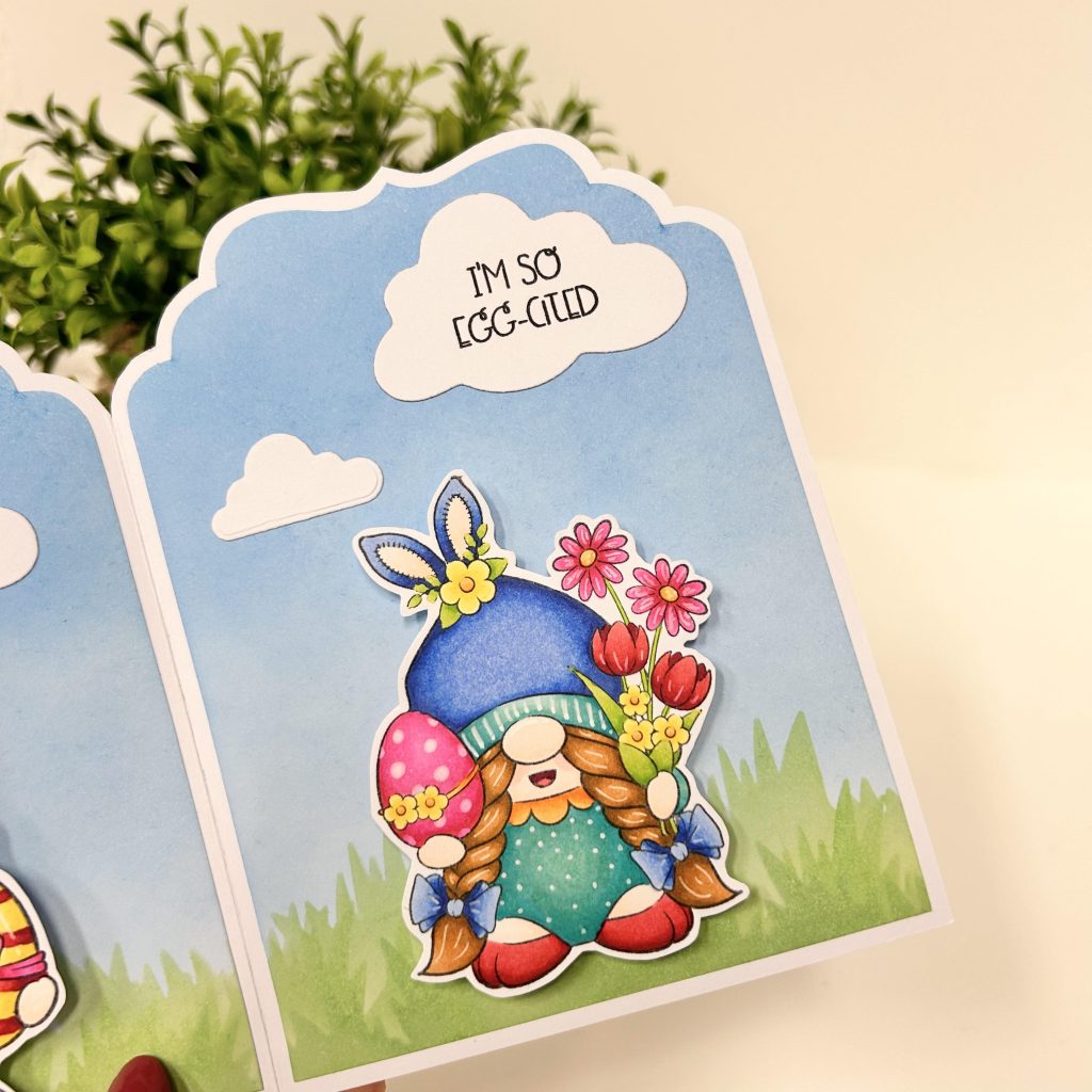 Mindy heeft voor de basis van haar kaart een tweeluik gemaakt met een pagina uit de album art box van Dutch Doobadoo. Door de mal 2 keer te tekenen met een rillijn ertussen krijg je dit leuke tweeluik. Voor de grasrandjes heeft ze het mask art gras gebruikt van Dutch Doobadoo en deze heeft ze op kleur gebracht met de groene inktjes van CraftLab. De leuke teksten op Mindy haar kaart zijn van de stempelset so-egg-cited van CraftLab. in deze stempelset zitten allemaal leuke Engelse teksten die je kunt gebruiken op je Paaskaartjes.