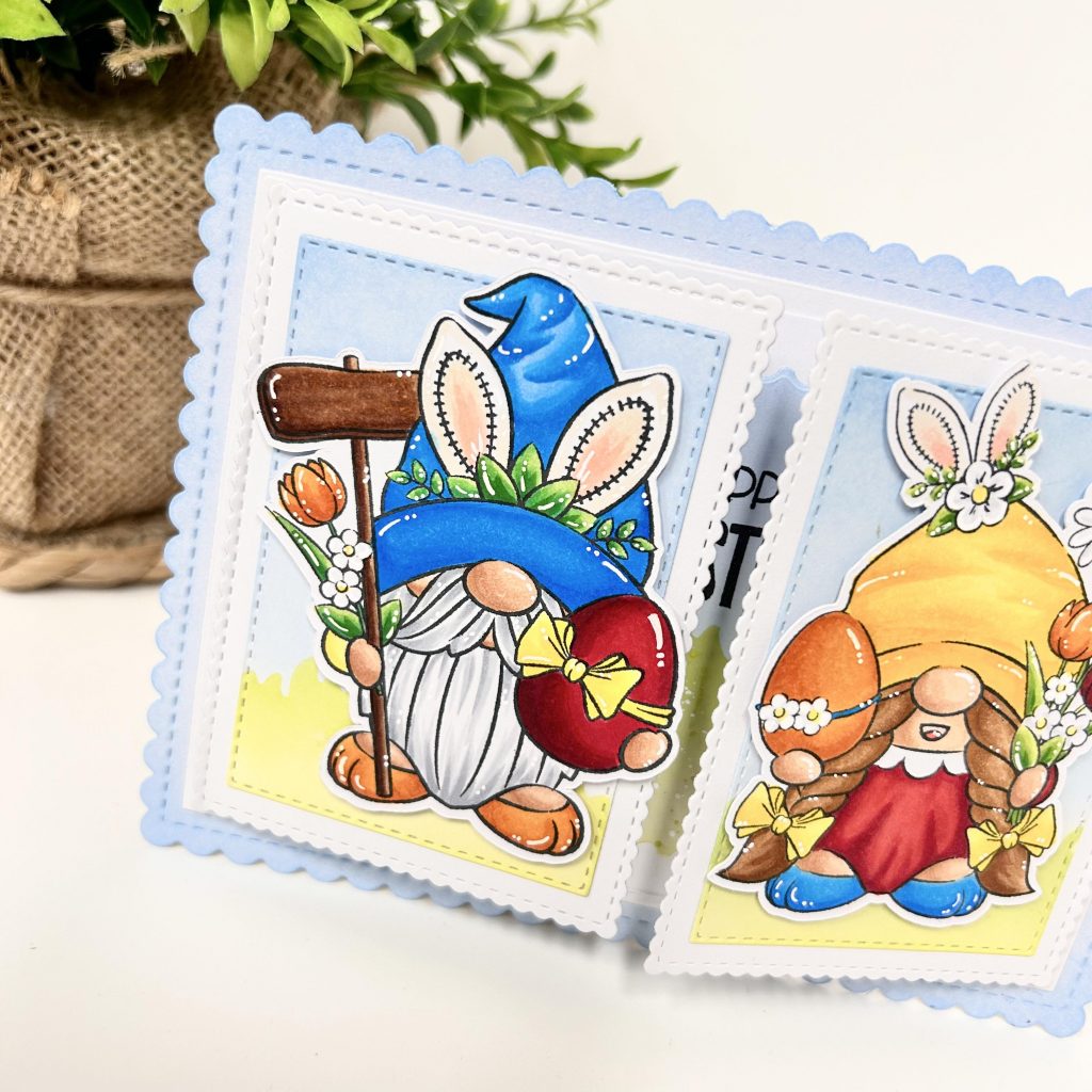 Ook Myrthe heeft de nieuwe stempels ingekleurd met copic markers en zie je hoe verschillend de stempels zijn geworden door het gebruik van andere kleuren. Myrthe heeft voor de basis van haar kaart de A6 essentials mal van CraftLab gebruikt. Op de a6 mal heeft Myrthe twee ATC kaartjes geplakt en deze alleen aan de zijkanten vastgeplakt zodat je de kaart nog kunt openvouwen. Aan de binnenkant van de kaart heeft Myrthe een achtergrond gemaakt met de inktjes van Craftlab en hier een tekst op gestempeld die ook uit de stempelset so egg-cited komt.