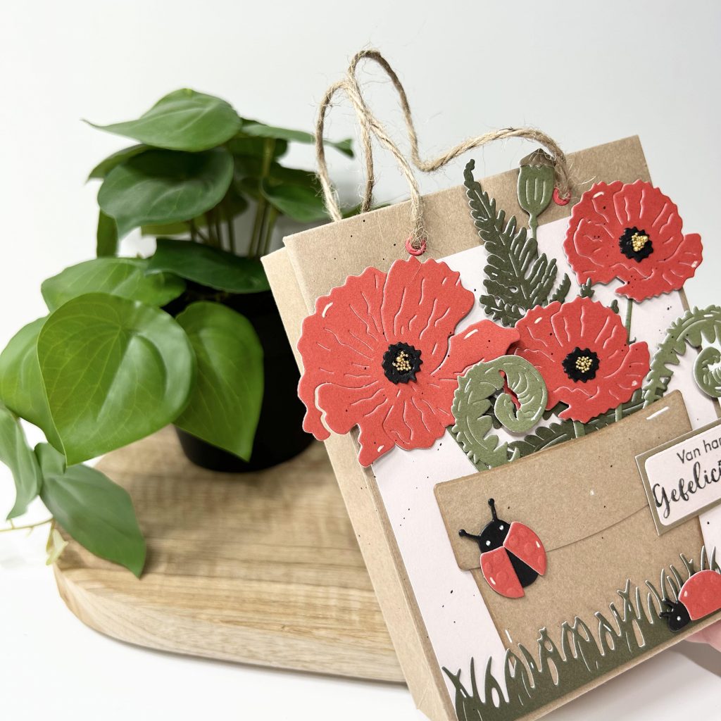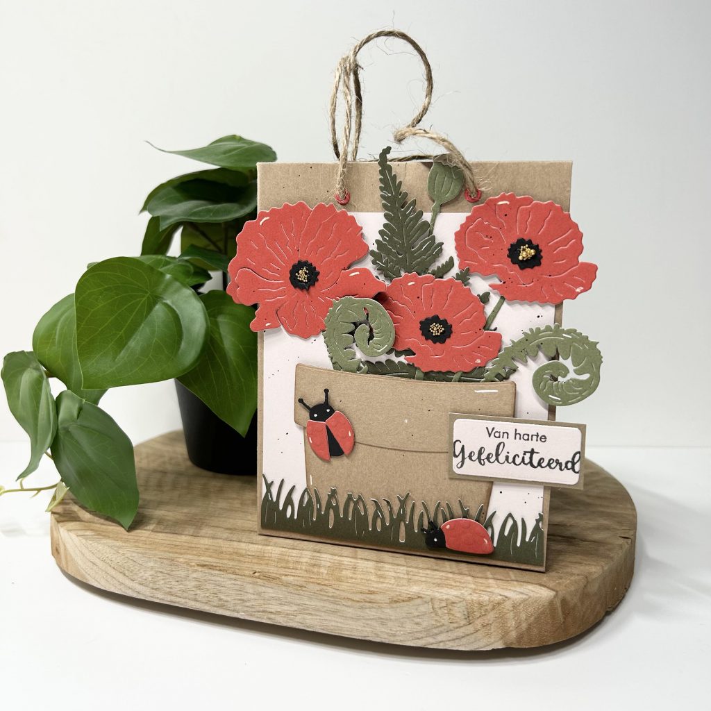 Anouk heeft voor de demo ook weer een keer de shopping bag van Marianne Design gebruikt. Dit is een craftstencil waar je een heel leuk tasje mee kunt maken. Anouk heeft voor de basis het kraft papier van Bella Lulu gebruikt omdat dit lekker stevig is. De klaprozen heeft Anouk in een bloempot gezet met ook de mooie nieuwe varen van Marianne Design. Deze mooie gedetailleerde mal kun je natuurlijk weer mooi combineren met de overige bloemen uit de collectie deze maand.