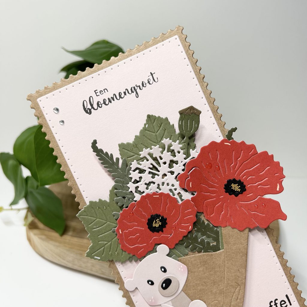 Anouk heeft afgelopen zaterdag weer een demo gegeven in de winkel met de juli collectie van Marianne Design. Deze maand zitten er in de collectie een hoop schitterende bloemen. Anouk heeft weer heel veel leuks gemaakt met deze nieuwe bloemen en dat laten we jullie graag zien in deze blog. De mooie klaproos is de blikvanger op onderstaande kaart. Anouk heeft de bloemen en bladeren gestanst uit het nieuwe kerstblok Magical Christmas van Studio Light. In dit papierblok zitten mooie groene en rode tinten die je perfect kunt gebruiken voor de bloemencollectie deze maand. Voor de basis heeft Anouk een slimline mal gebruikt van Marianne Design. Natuurlijk mag het beertje niet ontbreken, die houdt het bosje bloemen vast. De tekst een bloemengroet komt uit de nieuwe stempelset wensen voor u. Deze keer zijn dit allemaal teksten voor heel veel verschillende gelegenheden dus altijd een passende tekst voor op je bloemenkaart zoals een jubileum, verjaardag, beterschap of pensioen.