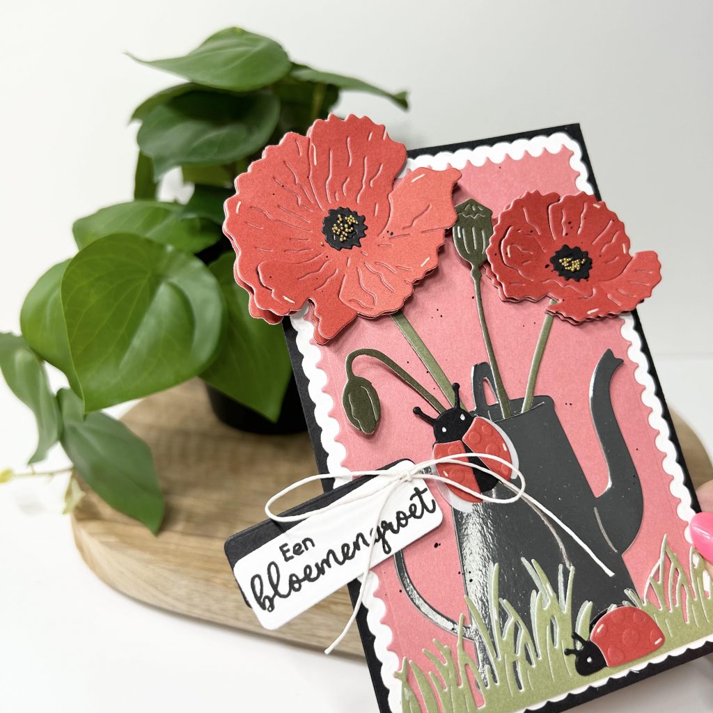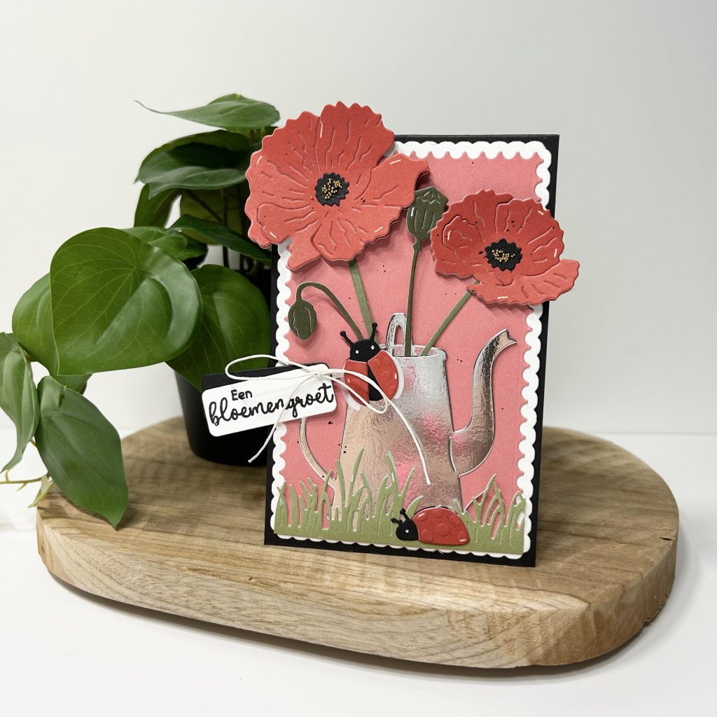 Bloemen zet je natuurlijk in een vaas, maar zoals je ziet kunnen de nieuwe bloemen ook perfect in de gieter van Marianne Design. Anouk heeft de gieter gestanst uit zilver spiegelkarton. De basis van de kaart is de nieuwe a6 mal van Marianne Design. Een hele veelzijdige mal die je uit verschillende lagen kunt opbouwen. Door de klaproos meerdere keren uit te stansen krijg je meer diepte in je kaart. Door weer het papierblok Magical Christmas te gebruiken passen de verschillende kleuren rood weer perfect bij elkaar. In het hart van de klaproos heeft Anouk de gouden flower pearls gebruikt waardoor het net een echte klaproos lijkt. De lieveheersbeestjes en een tekst maken de kaart helemaal af.