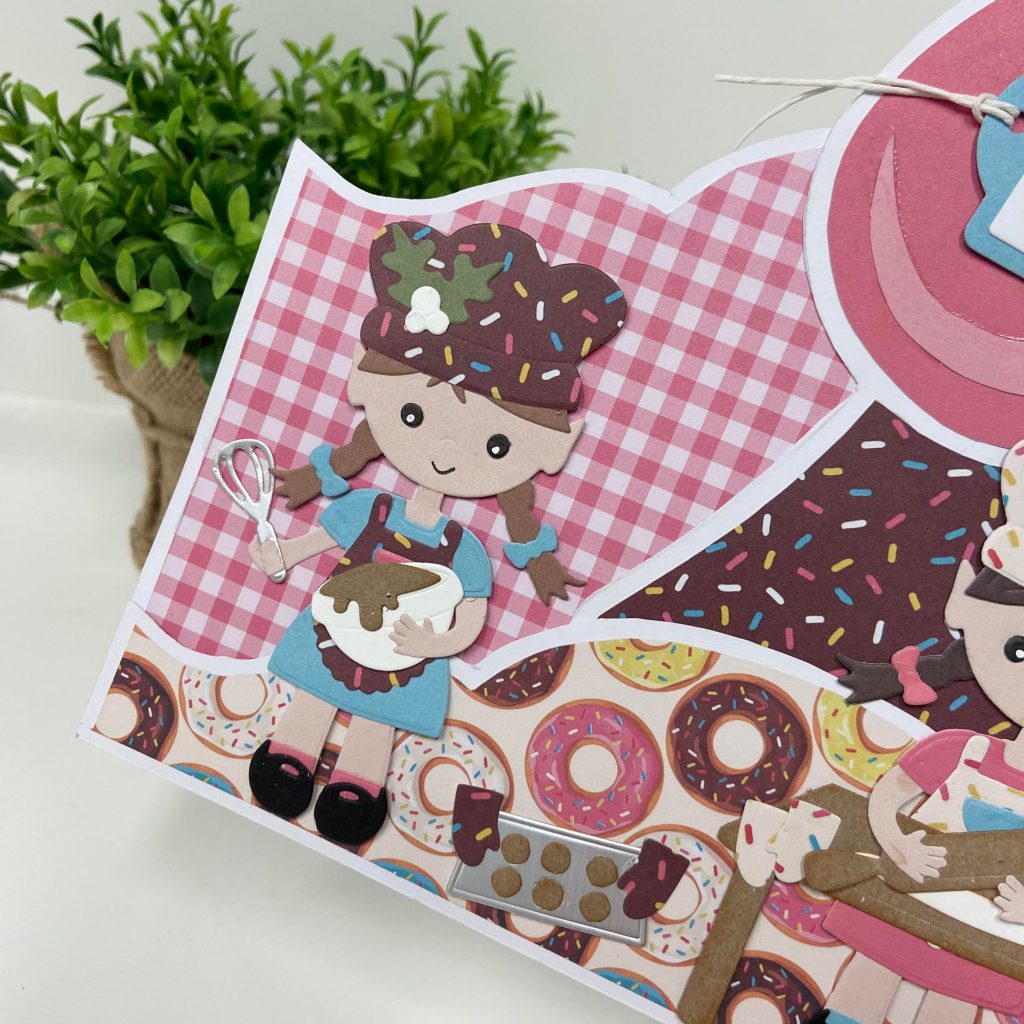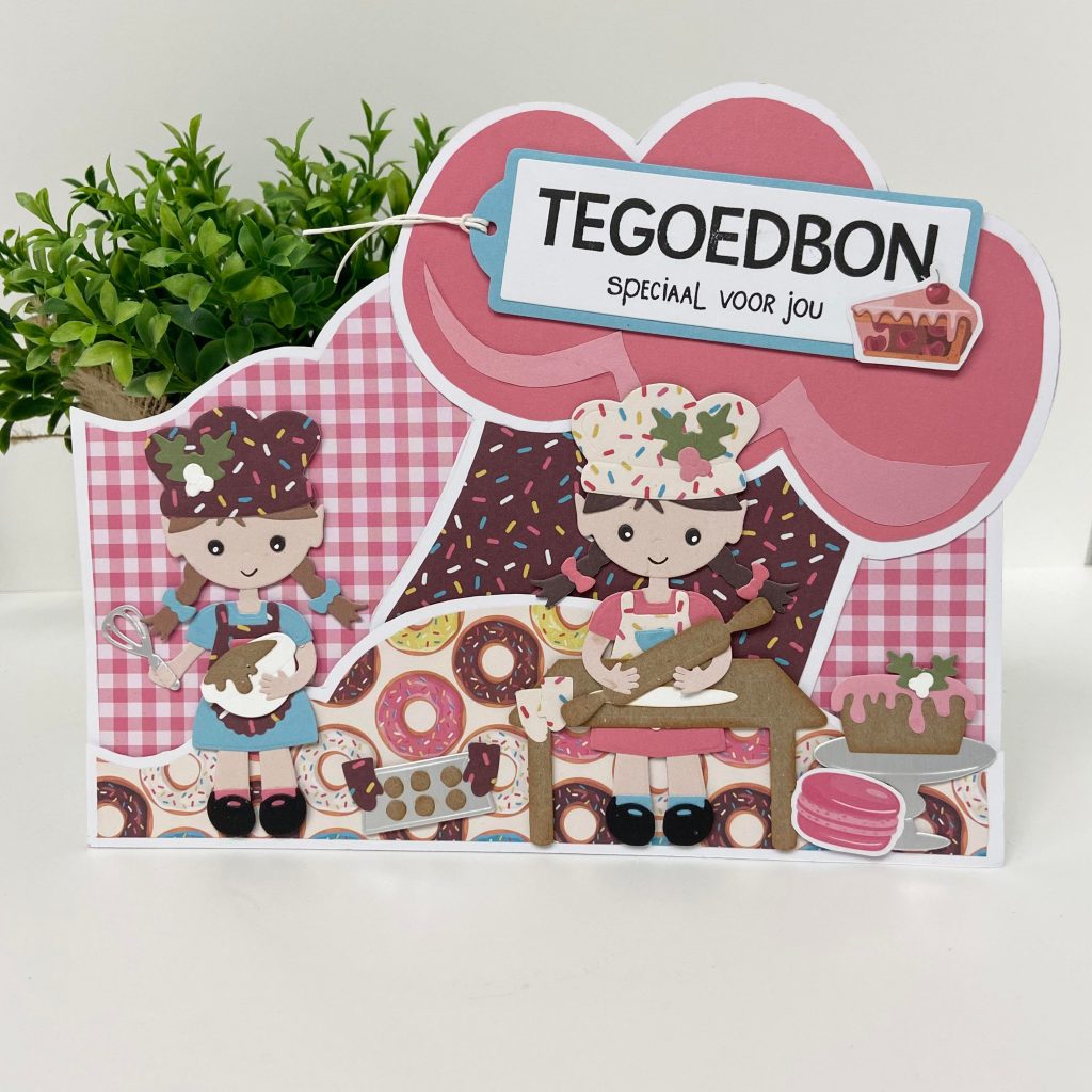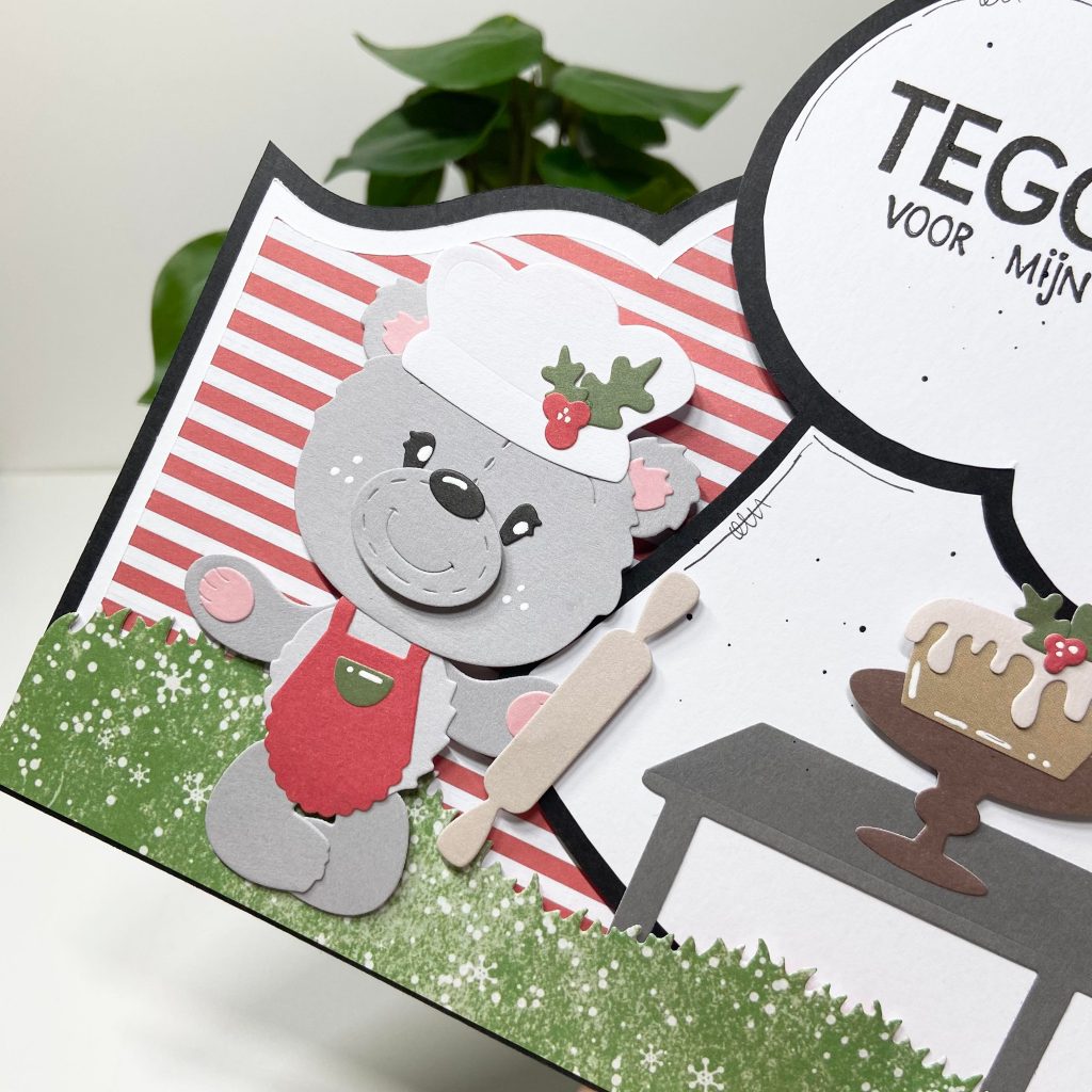 Ze heeft Ted aangekleed met de stansmallenset Let’s Bake. Ook de koksmuts past er natuurlijk prima bij. Dit is een tekenmal van Dutch Doobadoo. Ook Monica is met dezelfde materialen aan de slag gegaan en heeft er deze kaart mee gemaakt. Je kunt {HIER} de video van Monica terugkijken.