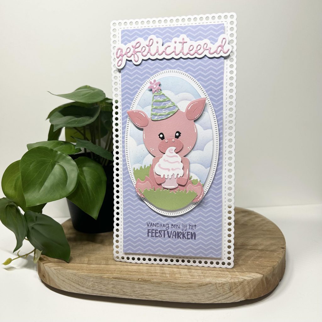 En dan nog deze leuke kaart met Frenkie gemaakt door Gerlinde om iemand te feliciteren. Deze is gemaakt met de pop up slider mal van Craftlab. Deze is ook leuk om als basis te gebruiken voor je slimline kaart. Als laatste nog de tekst van stempelset kadootje om de kaart af te maken.