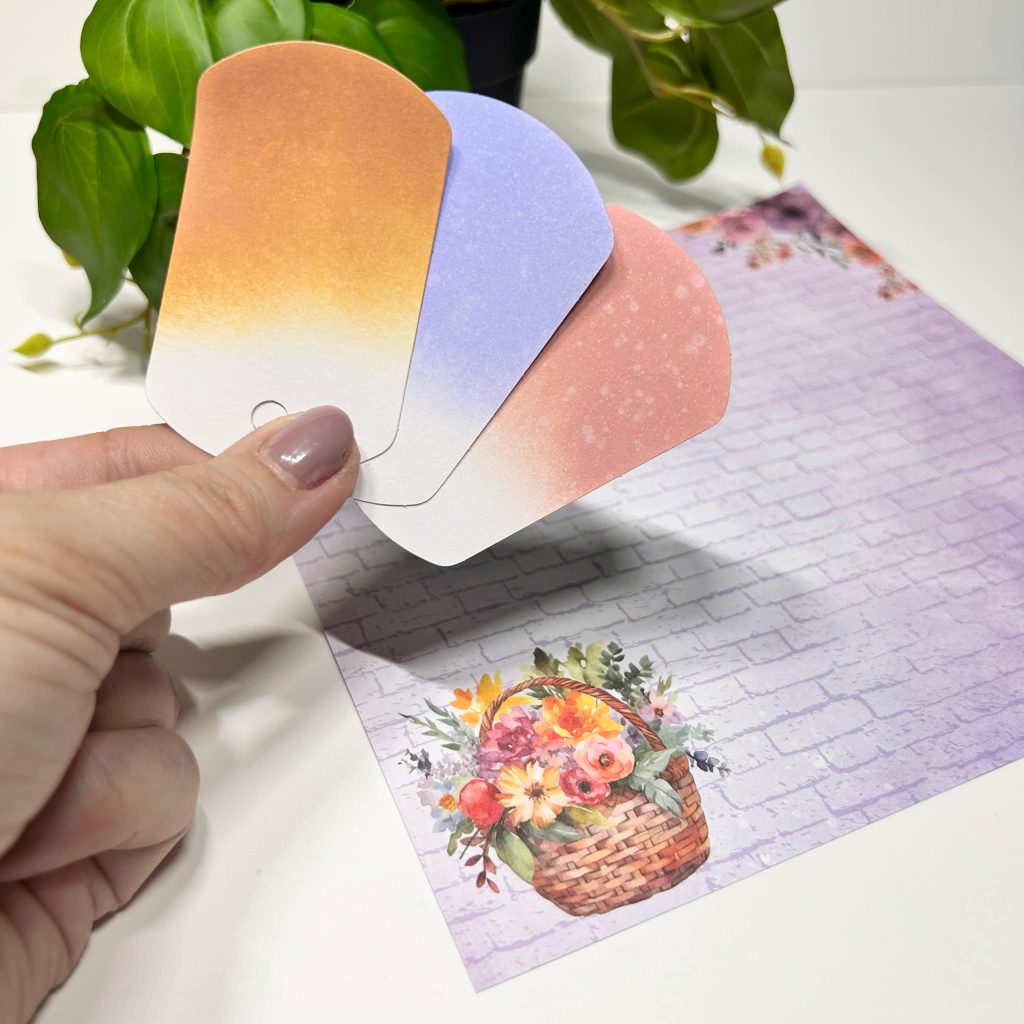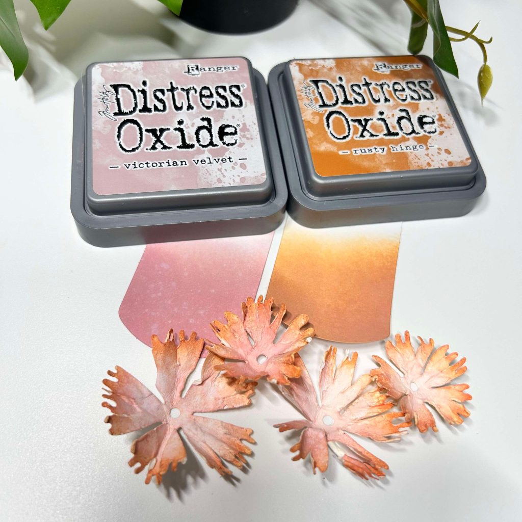 De bloemen zijn gestanst uit soft finish cardstock en vervolgens op kleur gemaakt met oxide inkten. Voor de bloem zelf zijn de kleuren victorian velvet en rusty hinge gebruikt. Deze kleurtjes passen weer perfect bij het paperpad Felicia.