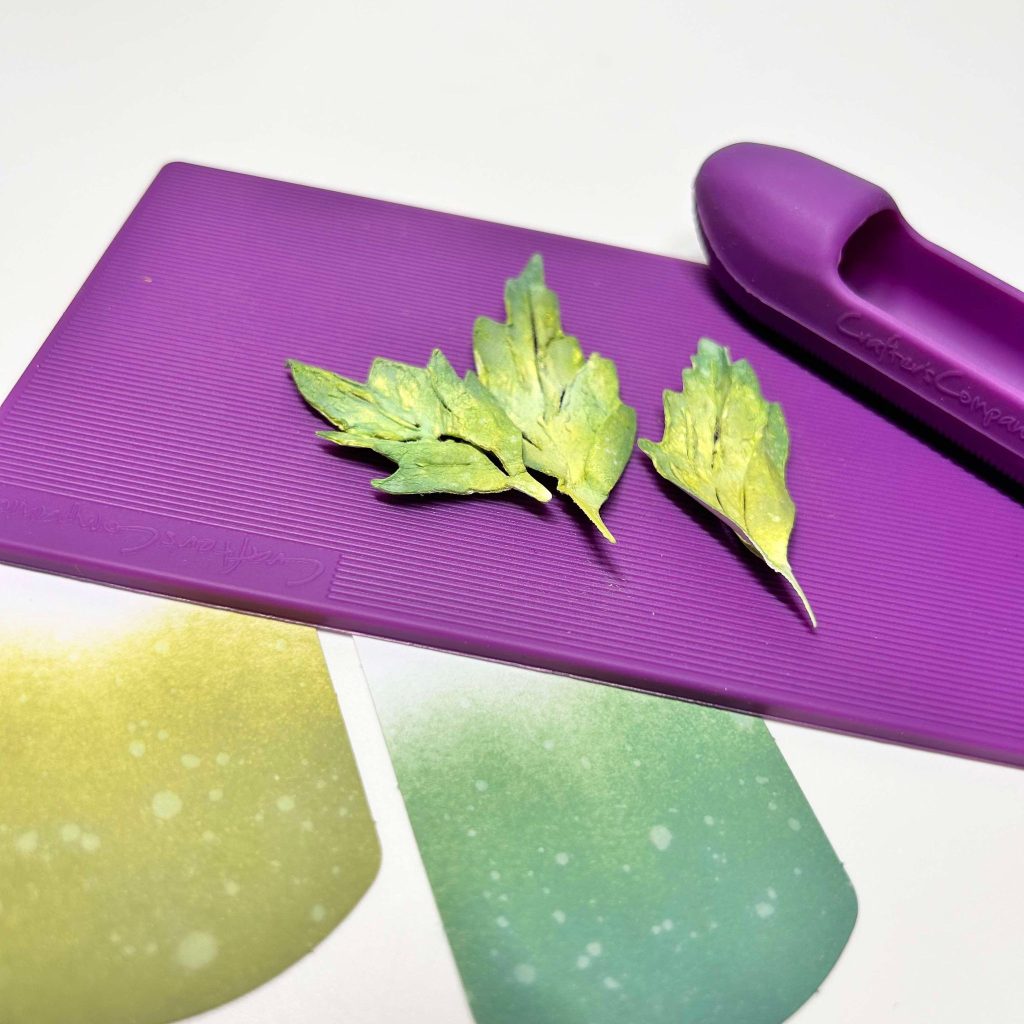 Voor de bladeren zijn de groene kleuren peeled paint en rustic wilderness gebruikt. Jolanda heeft in haar video ook laten zien hoe je de bloemen een beetje op kunt schuren door het gebruik van de nieuwe petal distress tool van Crafter’s Companion.