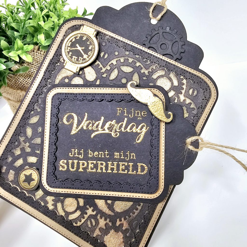 Voor de basis van beide tags heeft Joyce de large tag van CraftLab gebruikt. Deze heeft ze gestanst uit zwart cardstock. Joyce heeft het mooie stencil Gears van Studio Light daarna geëmbost en bewerkt met de embossing dabber. Door daarna met een sponsje verschillende soorten metallic panpastel aan te brengen wordt deze door de embossing dabber nog beter opgenomen en komen de metallic kleuren nog mooier naar voren. Joyce heeft daarna de panpastel nog met fixatief spray bewerkt zodat deze niet meer afgeeft. Voor onderstaande tag heeft Joyce de stempels van het horloge, de snor en de tekst bewerkt met goud embossingpoeder. De tekst heeft Joyce gestempeld op de kleinere tag van CraftLab die ze schuin op de grote tag heeft geplakt. Zo krijg je een hele luxe kaart voor Vaderdag.