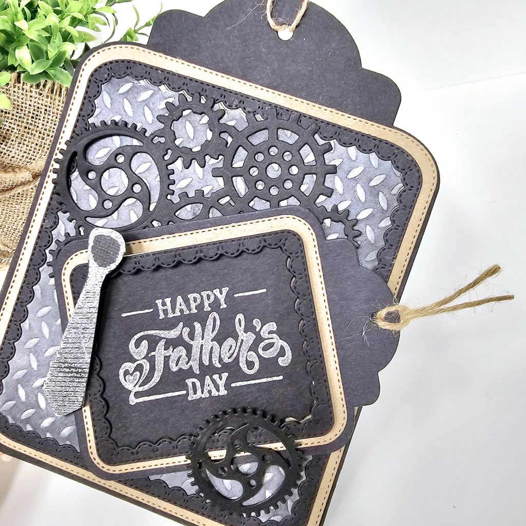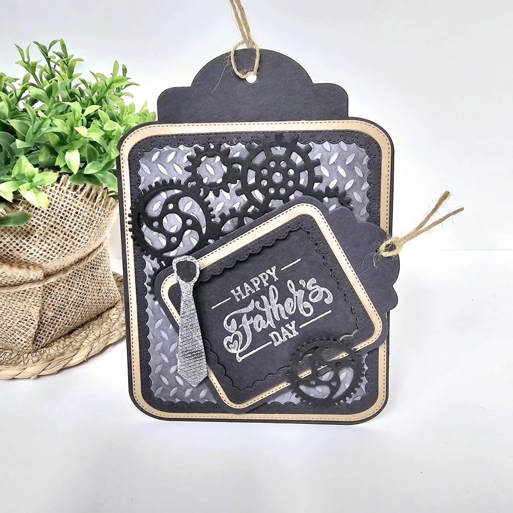 Voor onderstaande tag heeft Joyce voor de achtergrond het nieuwe stencil metal sheet van Studio Light gebruikt. Ook deze heeft ze geëmbost en bewerkt met panpastel. De mooie tandwielen zitten ook in de nieuwe gearhead’s collectie van Studio Light. Joyce heeft deze gestanst uit zwart cardstock zodat alles mooi bij elkaar past. De zilveren tekst heeft Joyce gestempeld met stazon inkt. Door het kleine label met foampads op te plakken krijg je ook wat diepte in de tag. Een los tandwiel en de stropdas maken deze kaart helemaal af.
