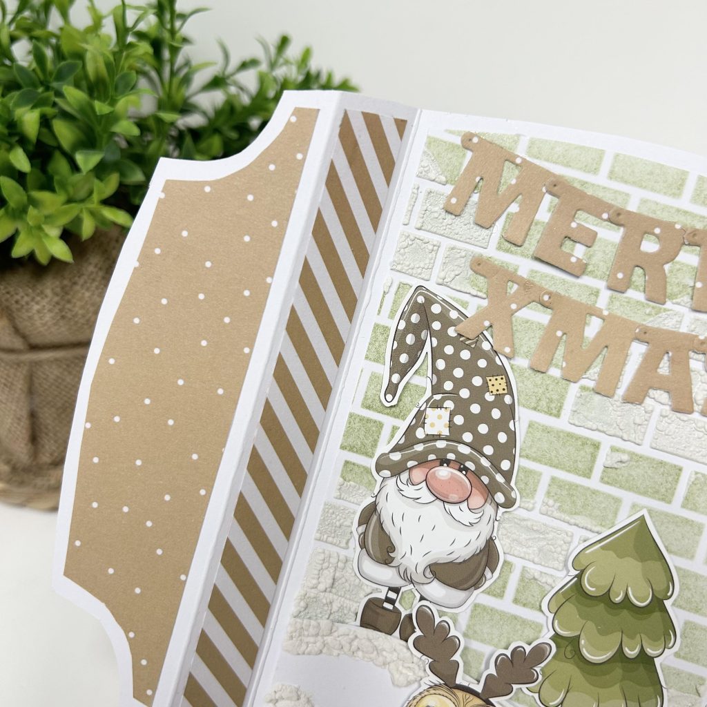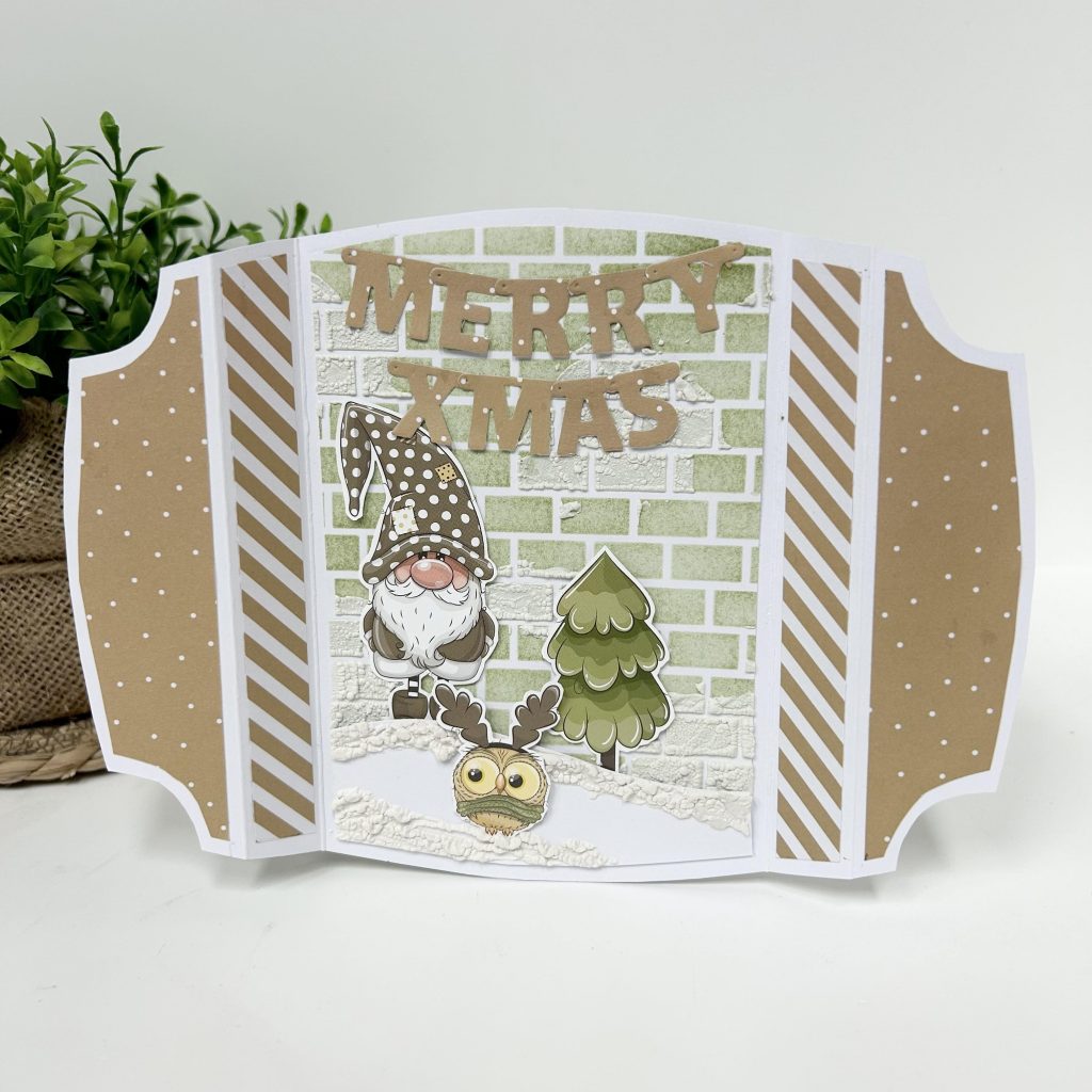 Voor onderstaand kaartje heeft Monica van de Shape Art Jef van Dutch Doobadoo een fancy fold card gemaakt. Ook op dit kaartje heeft ze het knipvel Fireplace van Bella Lulu gebuikt en het designpapier komt uit het stansblok Santa Stop here van Creative Craftlab.