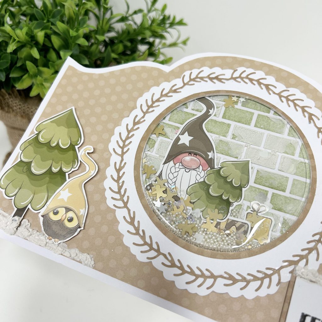 Monica heeft op onderstaand kaartje knipvel Fireplace en de stempel Kerst van Bella Lulu gebruikt. De blikvanger op dit kaartje is de shaker met de stansmal Holly Circle van Precious Marieke, de achtergrond in de shaker heeft Monica gemaakt met de Mask Art Bricks van Dutch Doobadoo. Het designpapier komt uit het papierblok Santa stop here van Creative Craftlab en voor de basis heeft ze de Shape Art Priscilla van Dutch Doobadoo gebruikt.