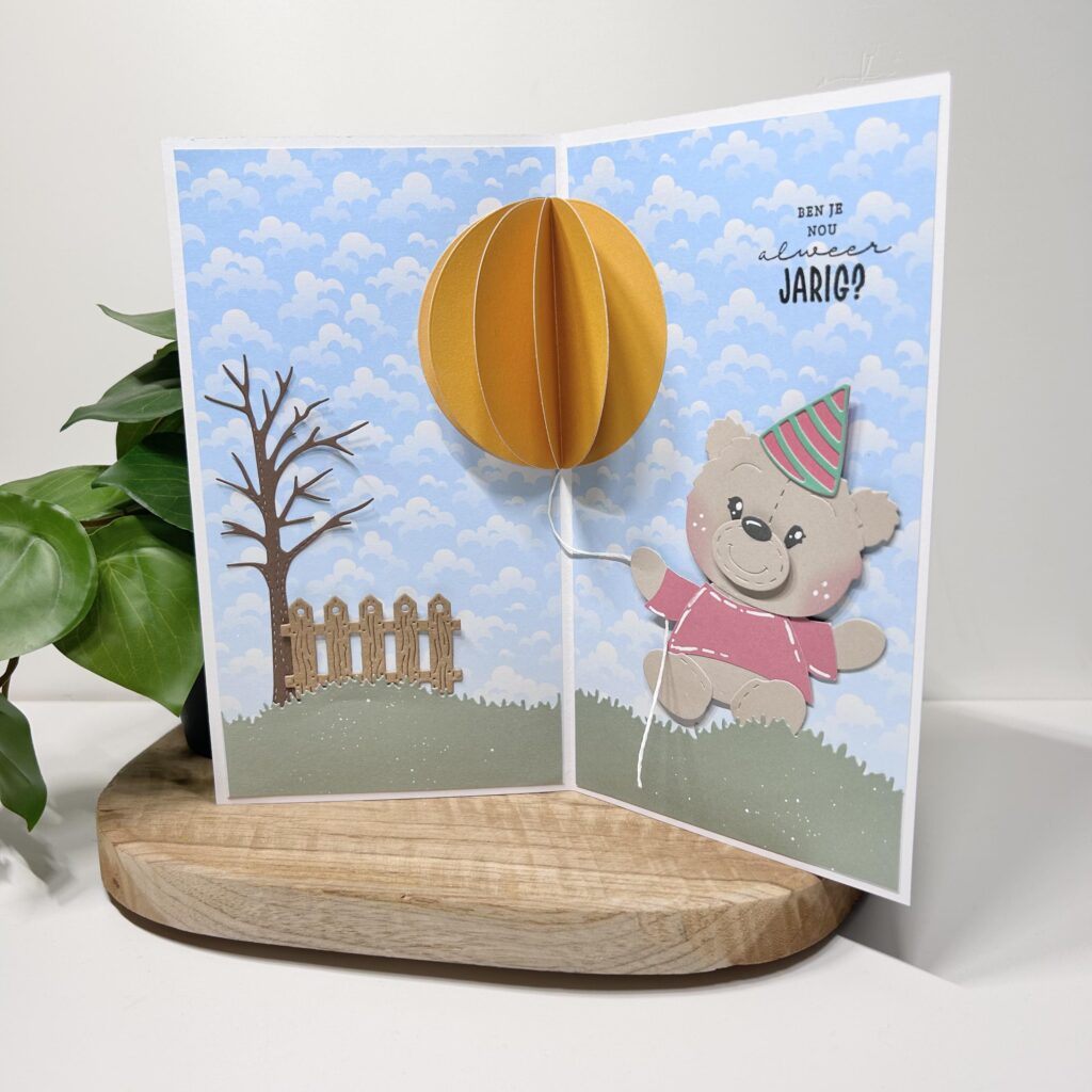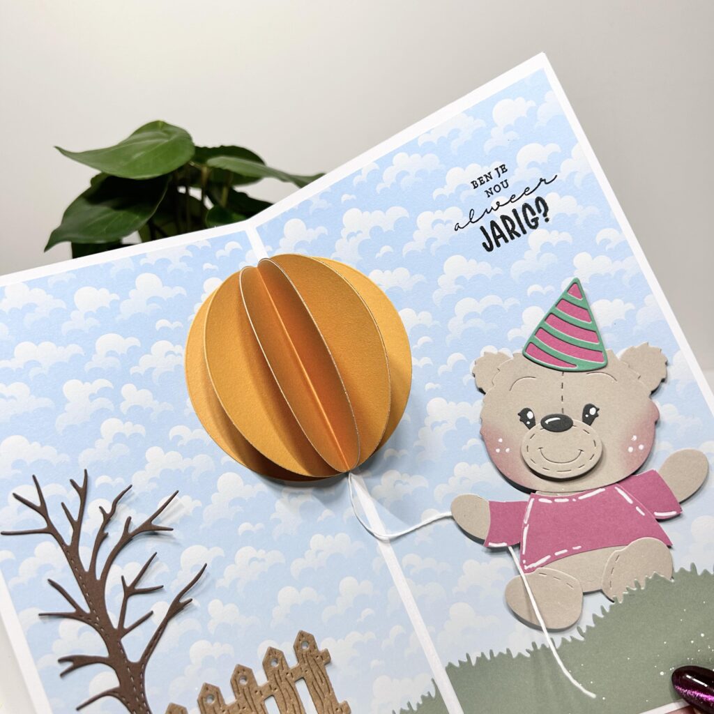 De eerste kaart gemaakt door Jolanda is de ballon in een dubbele kaart. Hier is voor jullie ook weer een aparte video van gemaakt. In deze video laat Jolanda ook zien hoe je het truitje voor onze beer Ted kunt maken.