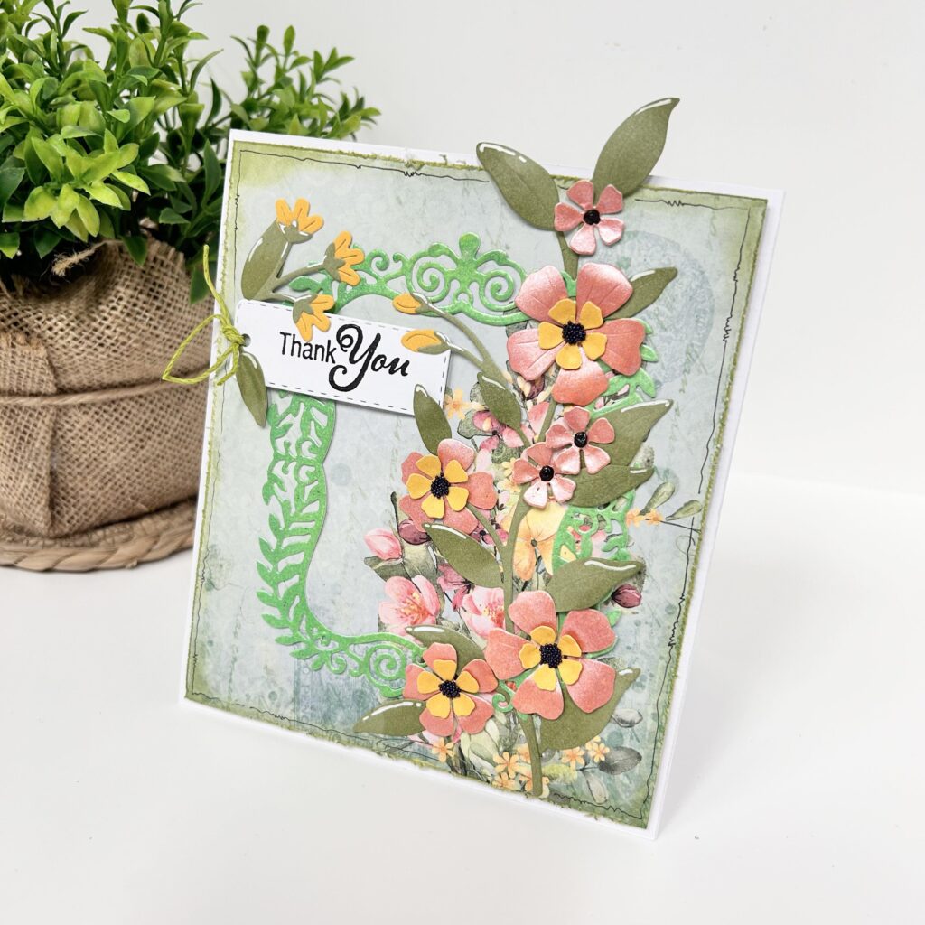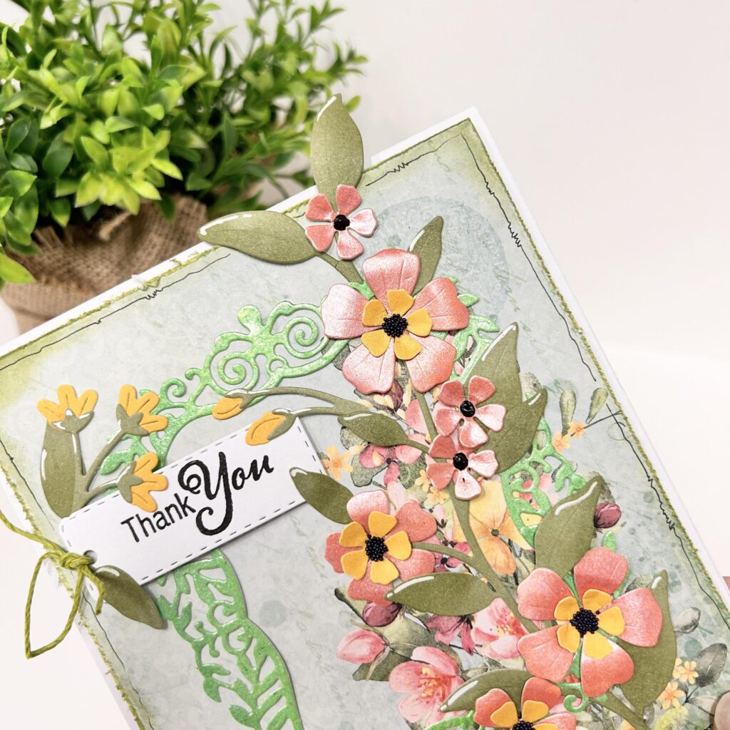 Op de 2e slimline kaart zie je ook het designpapier Garden Party en aan de bovenzijde heeft Natalie dat ietsje opgekruld. De bloemen uit set wildflower 4 zijn uit Vellum gestanst, wat van tevoren gesprayd is met Izink spray shiny roze poudré en orange pastel. De bloemen krijgen hierdoor een prachtig ’teer’ effect. Op de blaadjes heeft Natalie druppels gemaakt met de Dutch Doobadoo parelpen in het wit en op de andere takjes een glimmend effect gemaakt met de glossy pen van Studio Light.