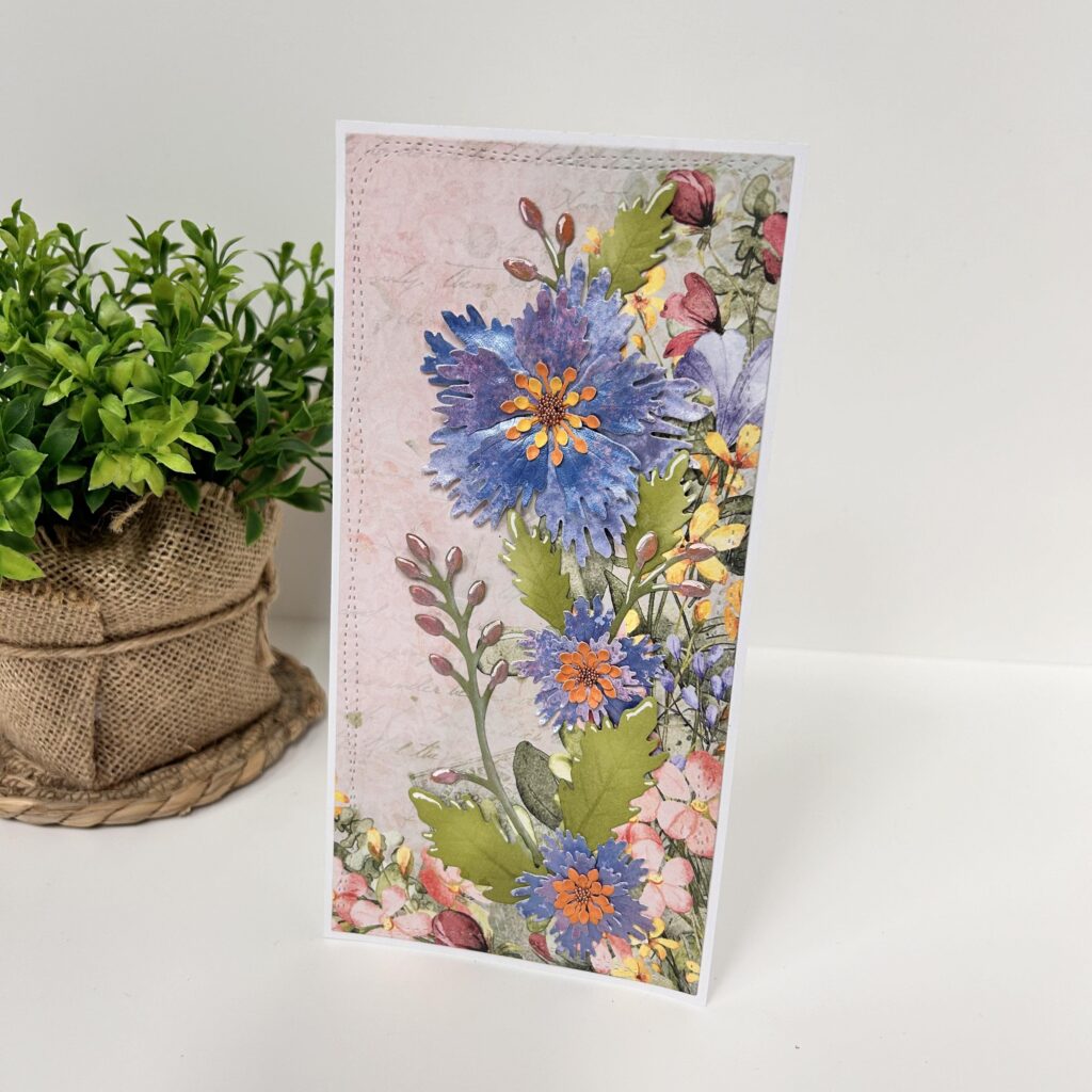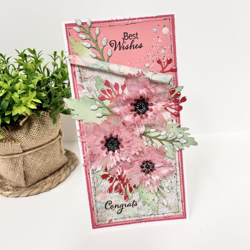 Op onderstaande slimline kaart zie je ook weer het mooie designpapier terugkomen en daarop de uitgestanste bloemen uit wildflower set 4. Deze bloemen zijn uit Bella Lulu cardstock gestanst wat eerst bewerkt is met Izink inktspray shiny roze pastel en violet pastel. Zo zie je dat je het Bella Lulu cardstock ook met sprays en water kunt bewerken.