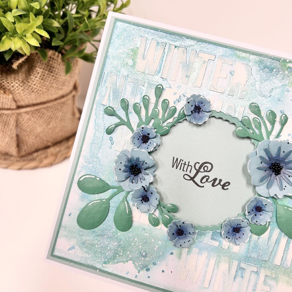 En uit de laatste kaart heeft Natalie een cirkel gestanst en hierom zijn de bloemen van set wildflowers 3 geplaatst. De achtergrond is gemaakt met de winter mask van Dutch doobadoo in combinatie met structuur pasta en inktspray shiny bleu clair en vert d’eau’. Met inktspray bleu clair en de witte spetteren van Molotow nog wat spettertjes voor de finishing touche.