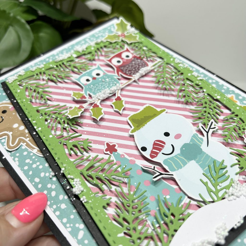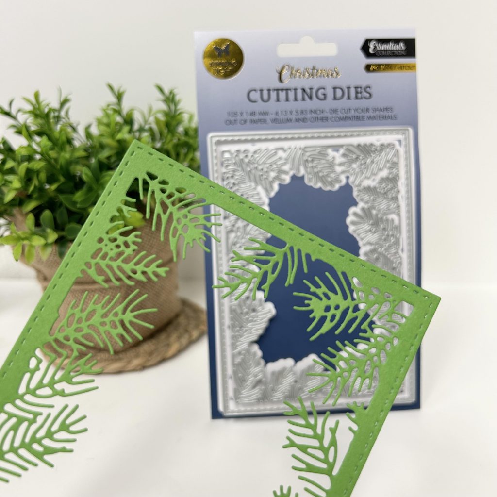 Ondanks het heerlijke weer blijven we nog lekker in de kerstkaarten. Want er zijn afgelopen week verschillende nieuwe artikelen binnen gekomen van Studio Light om alvast te starten met je voorraad kerstkaarten. Jolanda heeft de nieuwe passe partout mal van Studio Light gebruikt tijdens haar live. Het is een frame met dennentakjes.