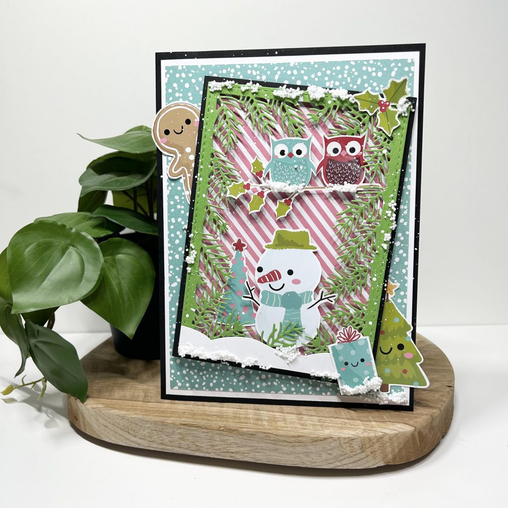 En daar past het nieuwe Bella lulu knipvel happy holidays perfect bij. Kijk hoe leuk de uiltjes vanuit de takjes vandaan komen en daaronder de sneeuwpop in de sneeuw. Dit nieuwe Bella Lulu knipvel is weer aangepast aan de kleurtjes van het CraftLab paperpad Happy Holidays.