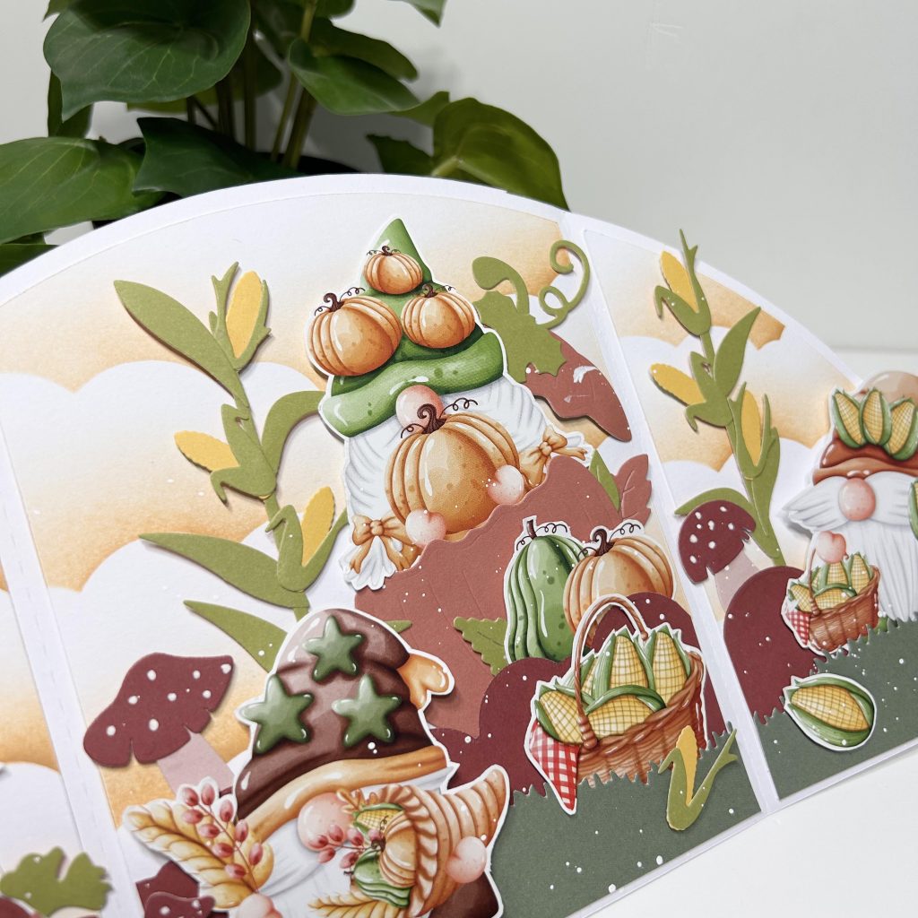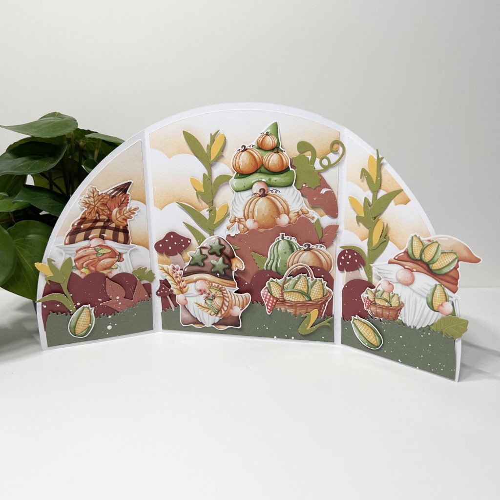De herfst laat dit jaar een poosje op zich wachten. Maar we zijn natuurlijk al wel gestart met het maken van herfstkaartjes. Jolanda heeft in een LIVE onderstaand drieluik gemaakt. Er is namelijk onlangs een nieuw Bella Lulu knipvel uitgekomen met het thema Hello Fall, boordevol gnooms in herfstthema.