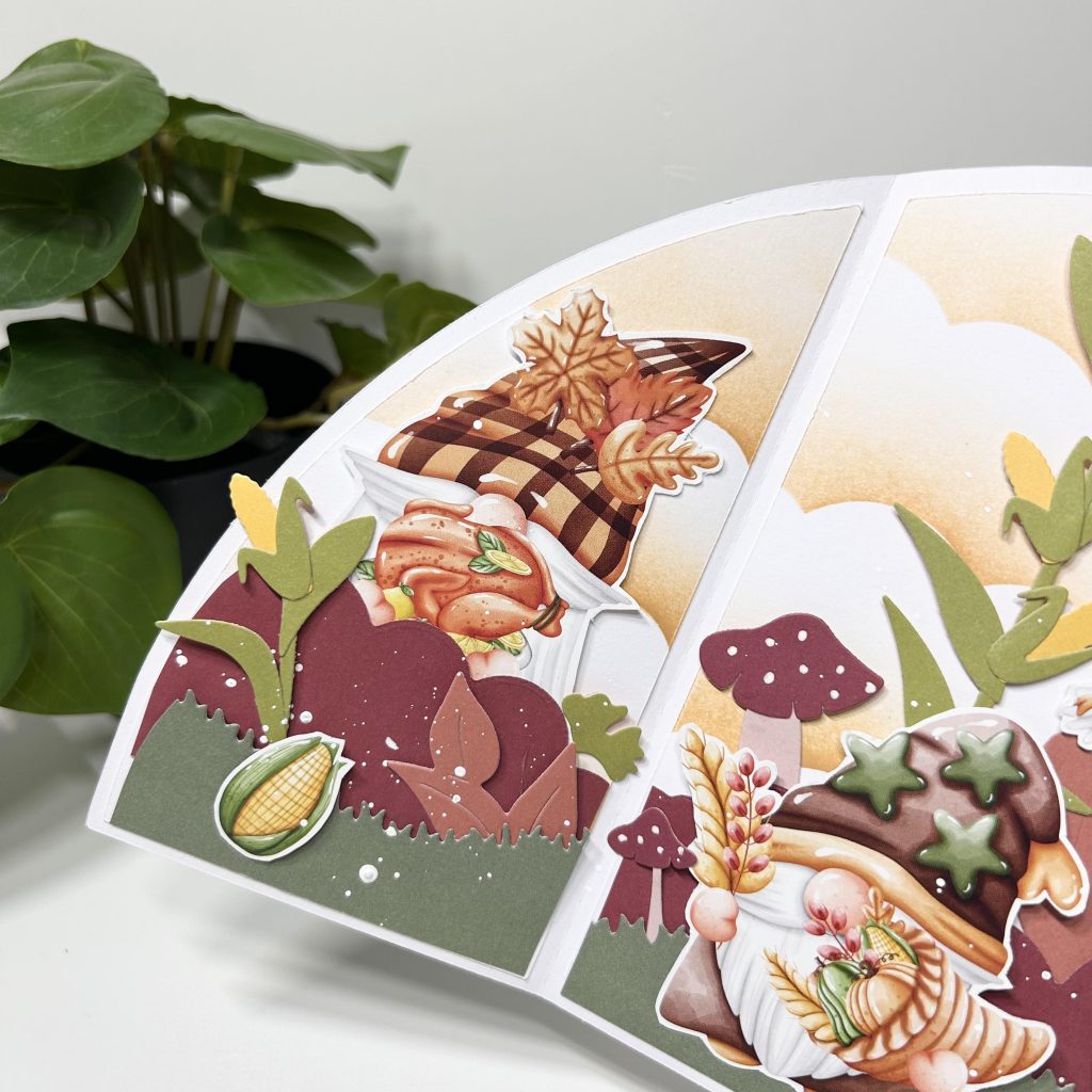 Op dit knipvel verzamelt de gnooms familie een mand vol maiskolven. Er is ook een stans van een maiskolf van Marianne Design dus die heeft Jolanda gecombineerd met deze plaatjes. De borderz stansen van CraftLab zijn gebruikt als gras en struikjes.