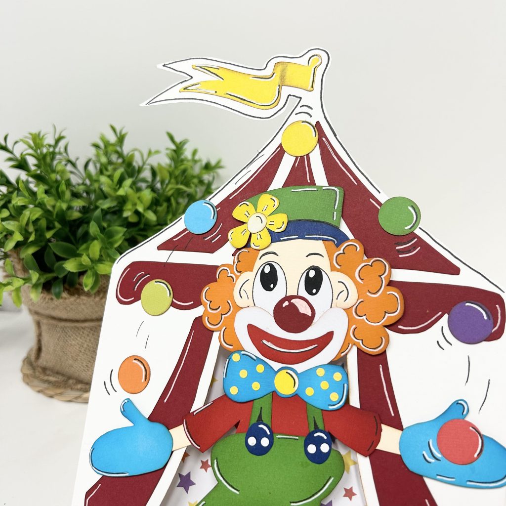 Ook de circus tent komt uit de nieuwe collectie. Door de verbindingen aan de buitenkant kun je de circustent dubbel maken en blijft hij staan. Zo maak je een doorkijk zodat het een echte tent lijkt. De ballen waar de clown mee jongleert kun je maken met de cirkel ponsset van Vaessen.