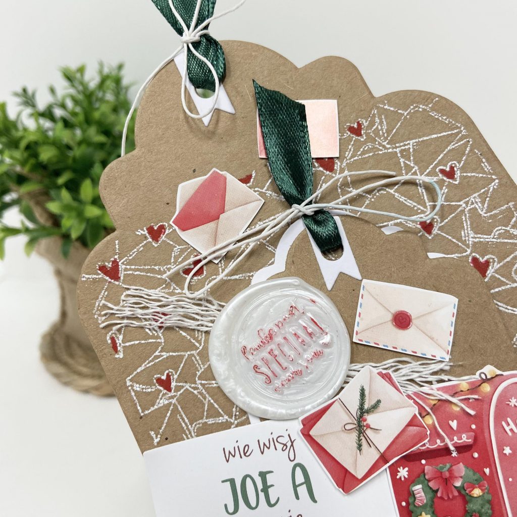 Ook op je kerstkaarten staan de waxzegels leuk. Het label van Craftlab is uit kraft gestanst en de achtergrondstempel met de enveloppen is er met witte inkt op gestempeld. Wat plaatjes van het nieuwe Bella Lulu knipvel kerstpost erbij en je hebt een leuke kerstkaart gemaakt.