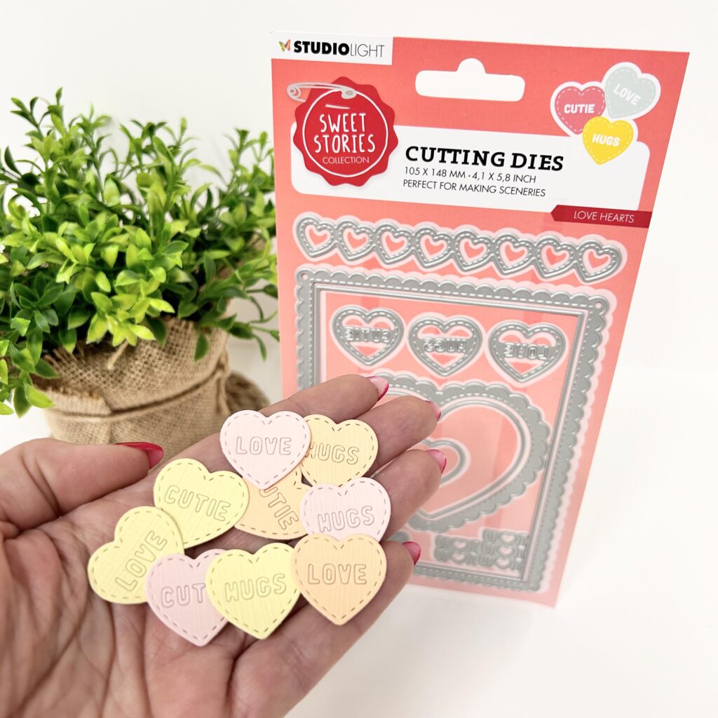 Voor de basis heeft Jolanda de spotlight stans love hearts gebruikt van Studiolight. Deze mal shop je nu met 50% korting van 17,99 voor 8,99 zolang de voorraad strekt. Het designpapier van Craftlab is bundle of joy en deze kleuren in het designpapier passen perfect bij de uitgestanste hartjes die in de spotlight mal zitten. Deze hartjes heeft Jolanda gestanst uit het nieuwe pastel cardstock van Bella Lulu.